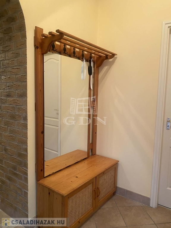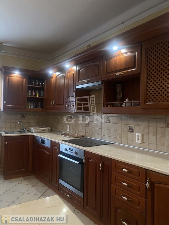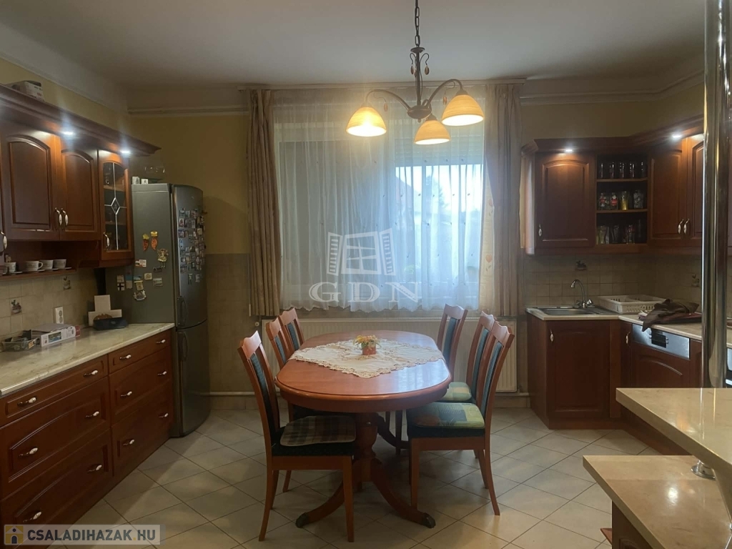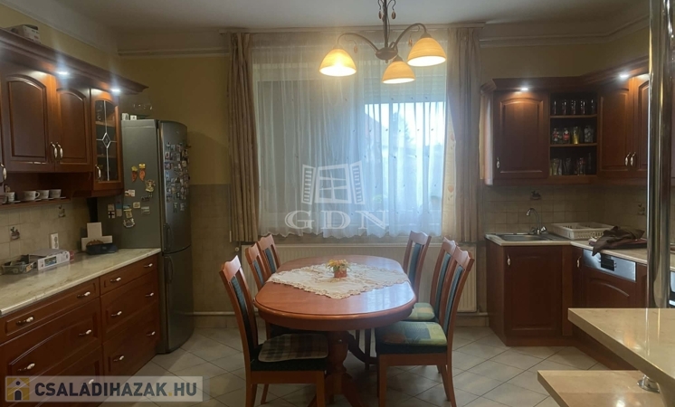 A ház egyik különleges értéke a gyönyörű, egyedi, tömörfából készült konyhabútor, amely elegáns, időtálló megjelenést biztosít.
