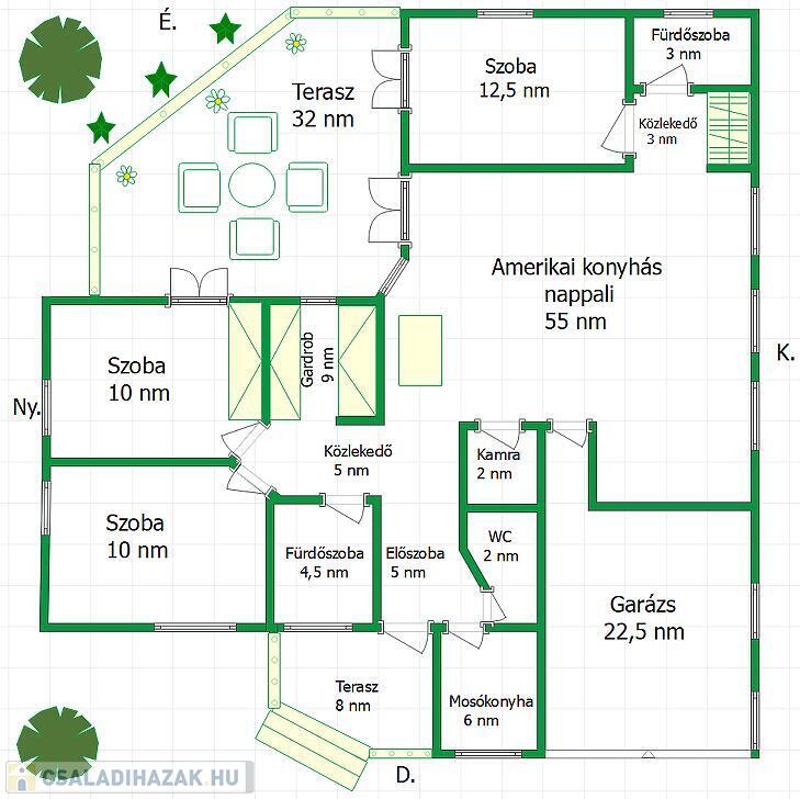 Az ingatlan átgondolt belső kialakítással rendelkezik: tágas, amerikai konyhás nappali, három hálószoba, két fürdőszoba, gardrób, mosókonyha, előszoba, kamra és külön WC.