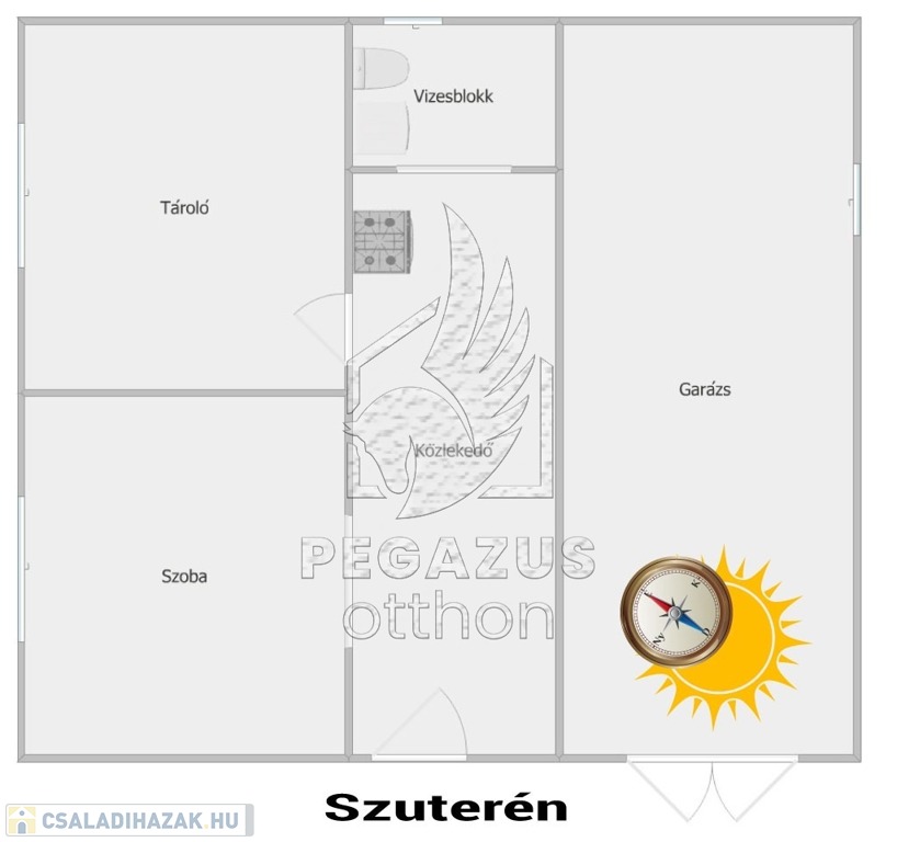 Az épület alatt egy szuterén szint is található, amely körülbelül 175 cm-es belmagasságával további hasznos tereket kínál: itt két nagyobb, akár hobbiszobának vagy tárolónak is alkalmas helyiség, valamint egy vizesblokk lett kialakítva.