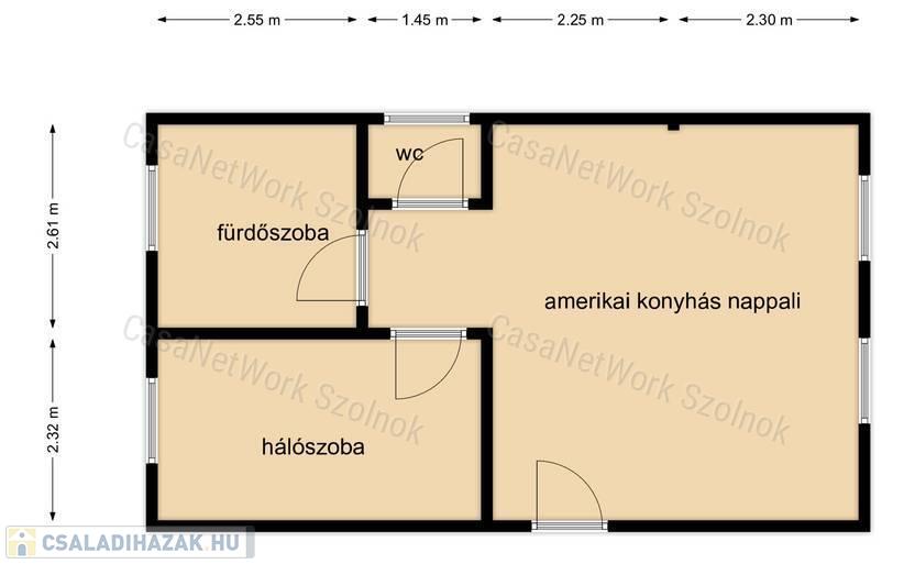 - a ház nettó alapterülete 56 m2 amelyben a következő helyiségek kerültek kialakításra: amerikai konyhás nappali, egy hálószoba és fürdőszoba és külön illemhelyiség
