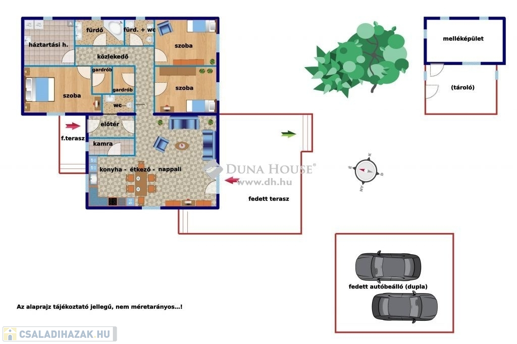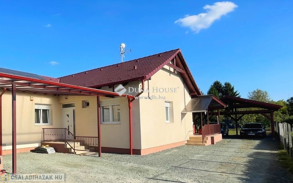 Az épület mellett két autónak fedett beálló van kialakítva..A telek hátsó felén egy melléképület is helyet kapott, mely, tárolásra vagy műhelynek, hobbihelyiségnek is alkalmas. A ház mögötti telekrész parkosított, füvesített...