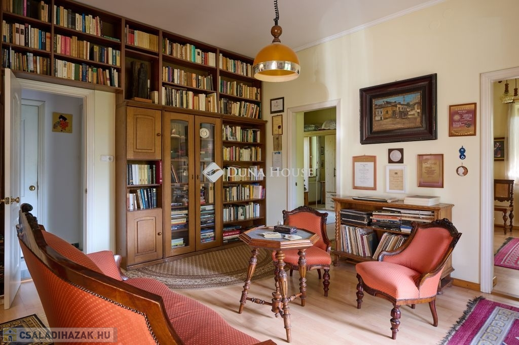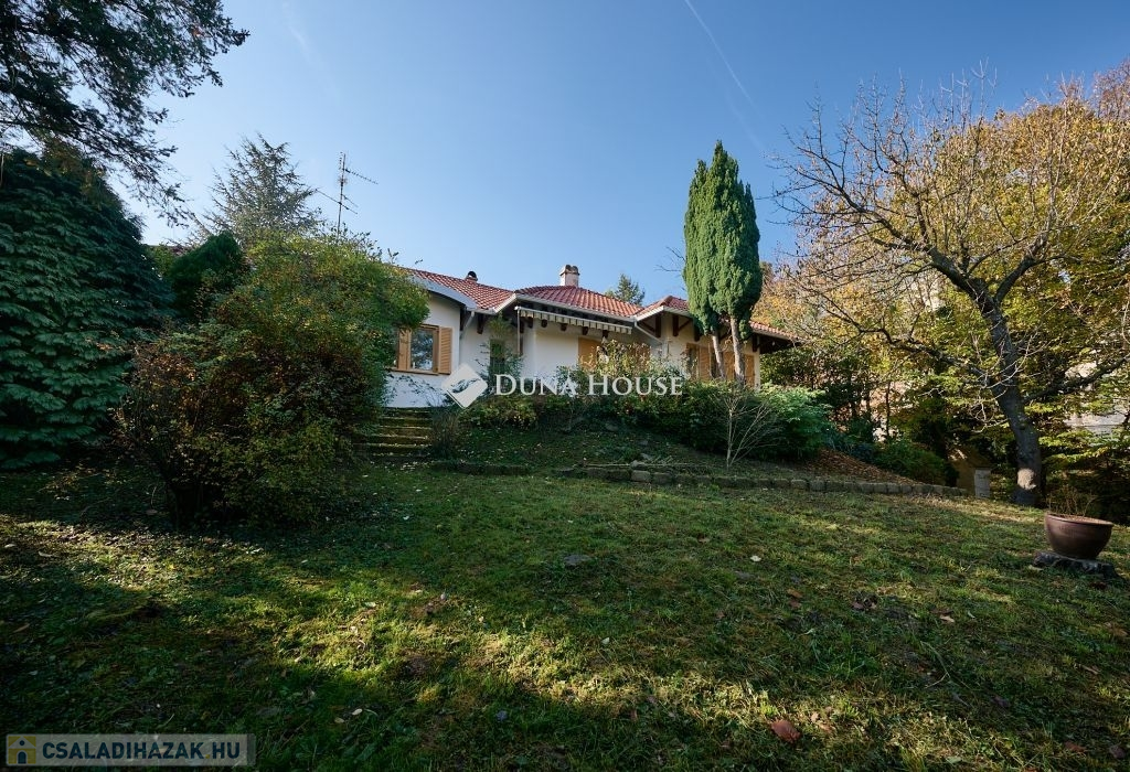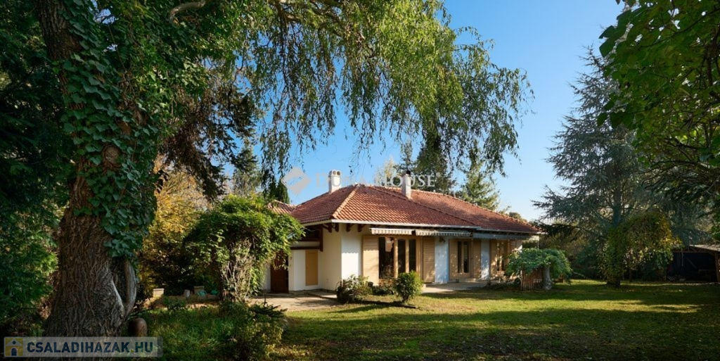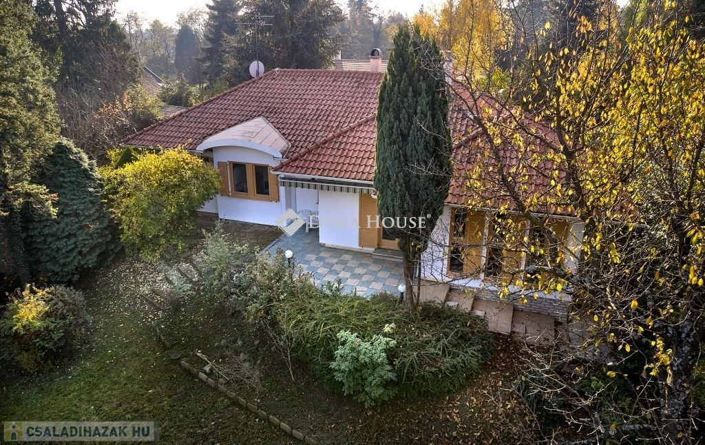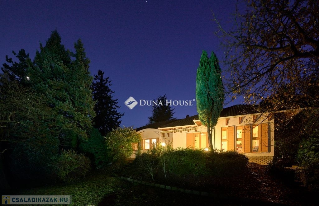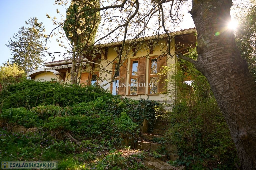 Az ingatlan egy csendes, forgalommentes zsákutcában bújik meg,a telken belül az épületet zöld oázis veszi körül. A ház külső modern-mediterrán megjelenése, polgárias belsővel ötvözött. A lakótér 120 m2, minden oldalról világos, körbenapozott. Tágas, kényelmes terek jellemzik, több irányból teraszkapcsolatos, keleti oldala panorámás kilátást biztosít a város felé.. Helyiségei: előtér-étkező-konyha-kamra-nappali-könyvtárszoba-hálószoba1-hálószoba2-fürdő+wc-közlekedő-külön wc.