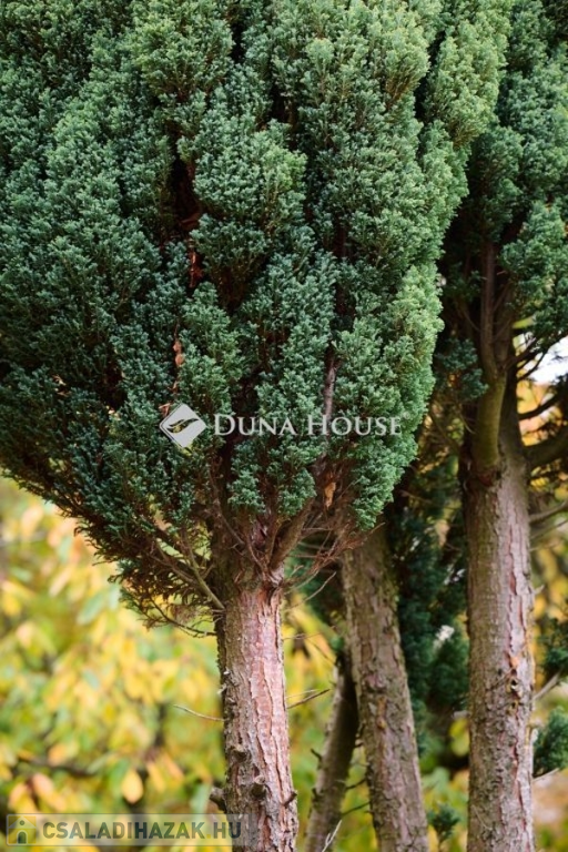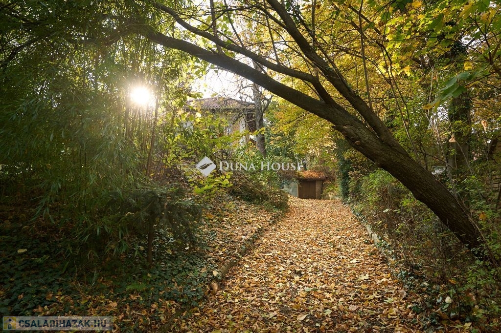 Az ingatlan egyediségét másfelől a kivételes adottságú, lankás, részben panorámás telek adja. Elhelyezkedése is kiváló, de páratlanságát az arborétum jellegű környezet adja. A telek méretei is kivételesek a környéken, kb. 40x 60 m, akár meg is osztható, további beépítésre is van lehetőség. Autóval két utcából is megközelíthető. A különálló garázshoz a kert belváros felőli oldalán lehet behajtani.