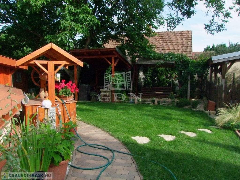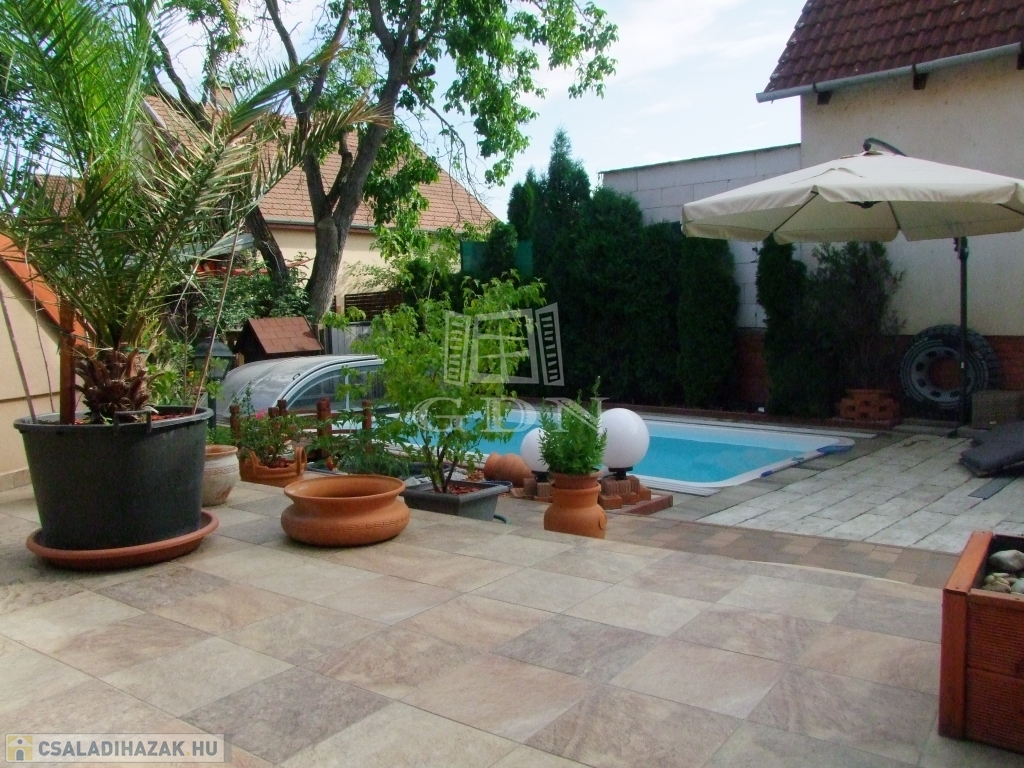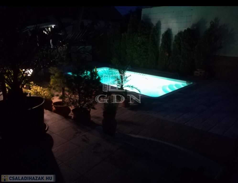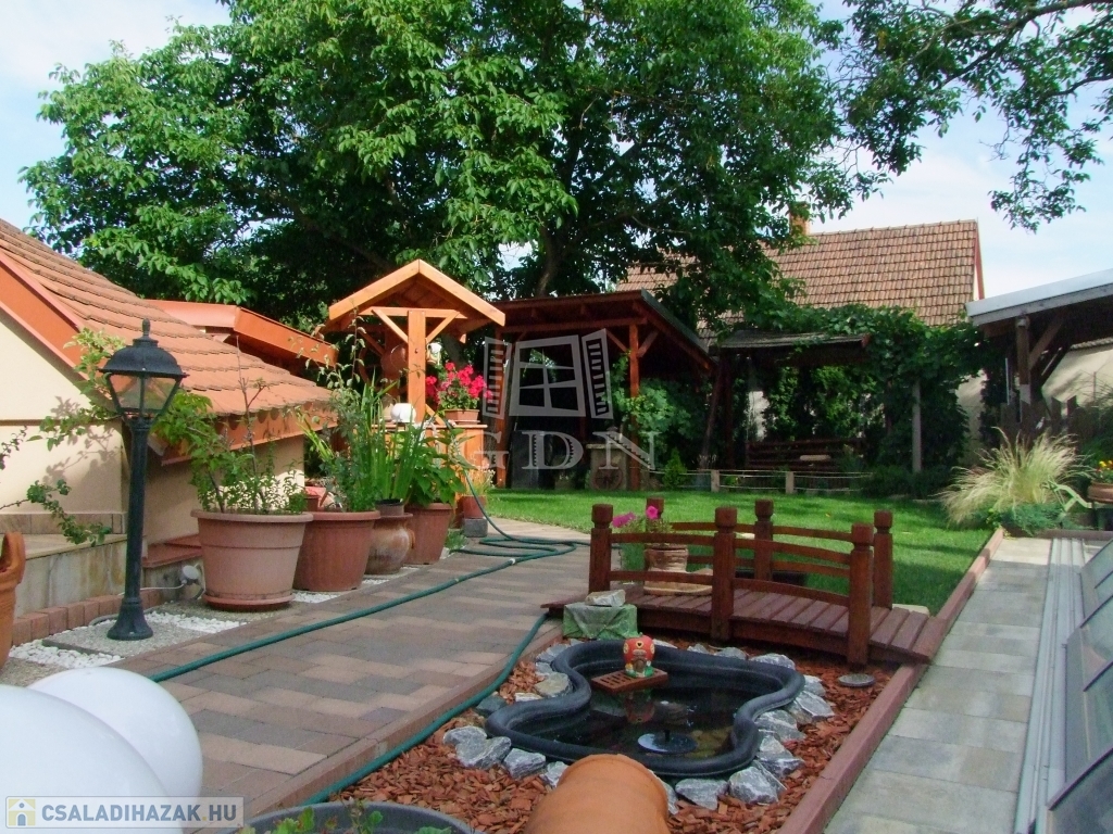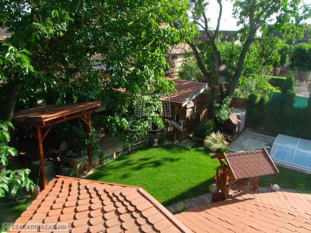 A gondozott parkosított udvaron fedett gépkocsibeálló, 18 m2-es 1.5 m mély fedett medence, kerti hinta, grillező és kerti faház található.