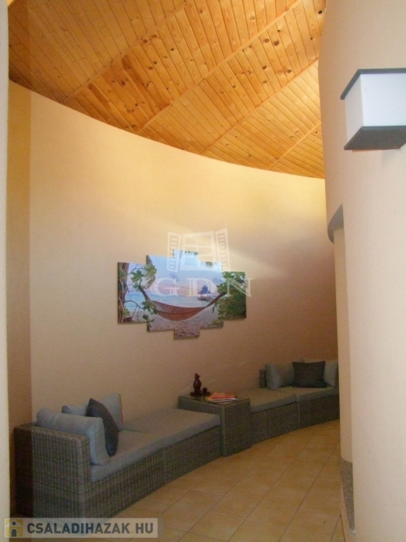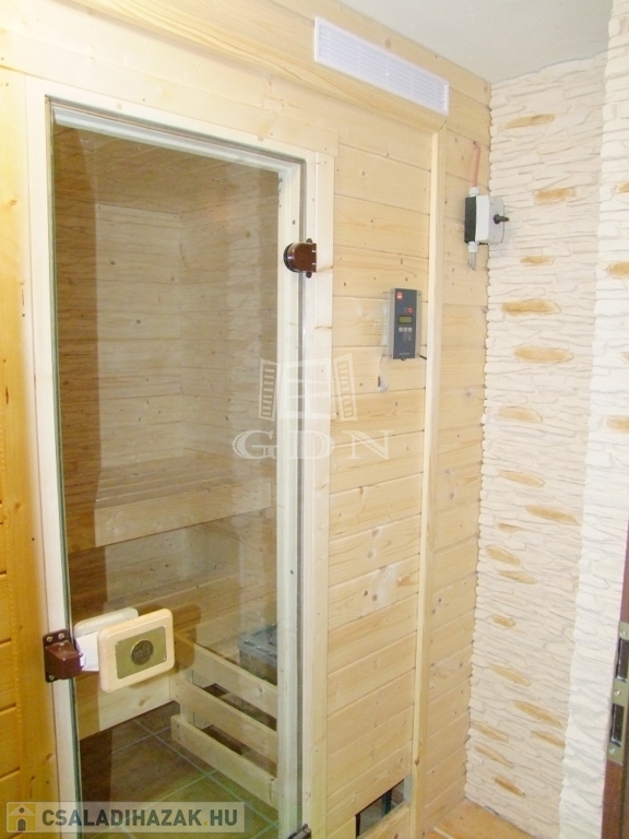 A pincében mini wellness részleget találunk. Szolárium és szauna segíti a mindennapi stressz feloldását. Ezen a szinten még háztartási helyiség, ikergarázs és egy 40 m-es vállalkozás céljára kialakított helyiség is van.