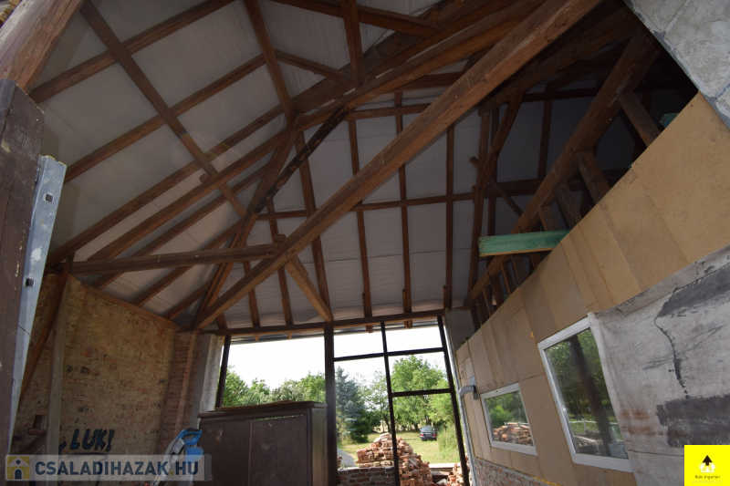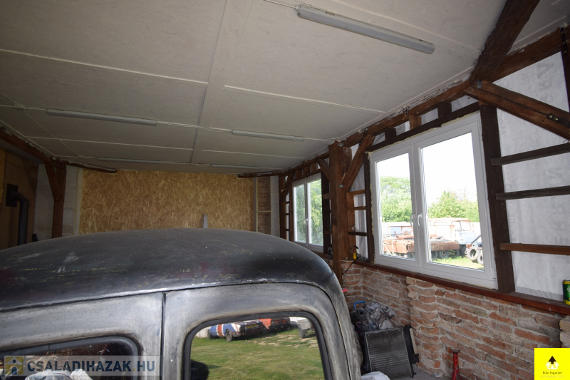 A harmadik és talán a legérdekesebb épület egy 200 m2 alapterületű rendkívül masszív pajta épület, amelynek jelenleg a fele felett van tető. A pillérek állnak és az eredeti elképzelés szerint egy nyitott szín lett volna, de természetesen ez másképp is kivitelezhető. Mivel a térképen az eredeti 200 m2 szerepel ez mindenféle engedély nélkül megoldható. A pajta belmagassága 4 méter !! így akár raktározási célokra is kiválóan alkalmas lehet, de lakóházzá is alakítható. A pajta betongerendával körbe van vasalva és 20 cm vastag Fiber erősítéssel ellátott aljzatbetont kapott így rendkívül erős és masszív lett. Nagy gépek, teherautók, vagy nehéz dolgok tárolására is kiválóan alkalmas lehet. Az épületben egy 45 m2 -es fűthető részben hőszigetelt "pajta műhely" lett kialakítva amely fűthető részben hőszigetelt és könnyűszerkezetes falazattal rendelkezik. A pajta tetőterét pedig szintén többféleképpen hasznosíthatjuk hatalmas méretlének köszönhetően. Lehet tágas lakás, raktár vagy műterem, de hagyhatjuk így nyitottan is az óriási belmagasságának köszönhetően galériásan is.