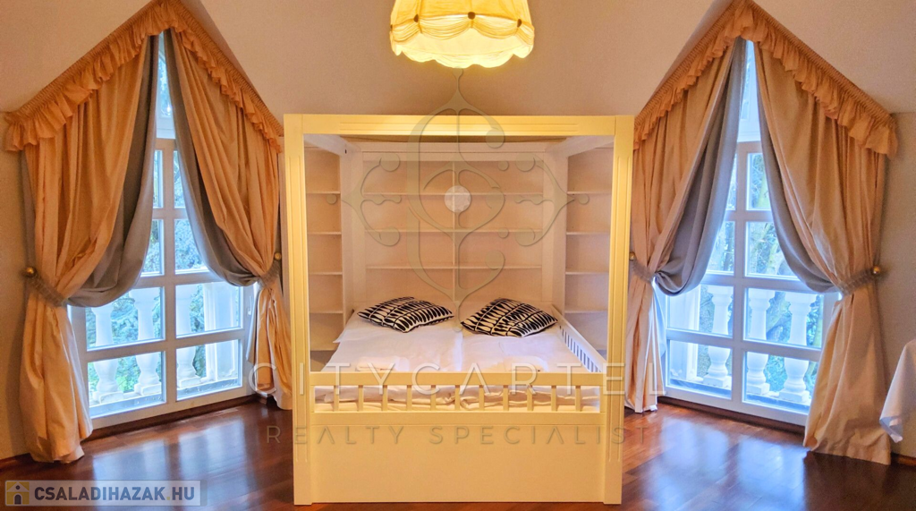 Minden helyiségben minőségi selyemtapéta borítja a falakat, az ablakokat pedig egyedi tervezésű selyemfüggönyök keretezik.