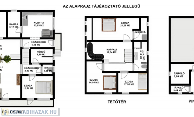 A tetőtérben egy további nappali, három külön nyíló szoba kapott helyet, melyek mindegyikében beépített gardrób vagy praktikus tároló található. Ezen a szinten egy fürdőszoba WC-vel egyben, valamint egy külön mosóhelyiség is kialakításra került.