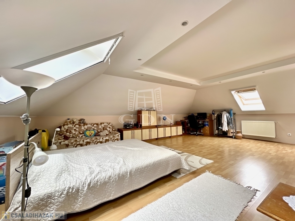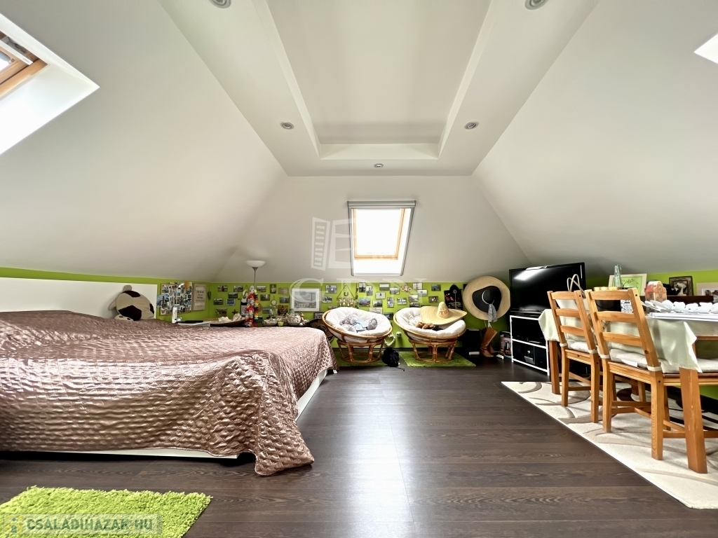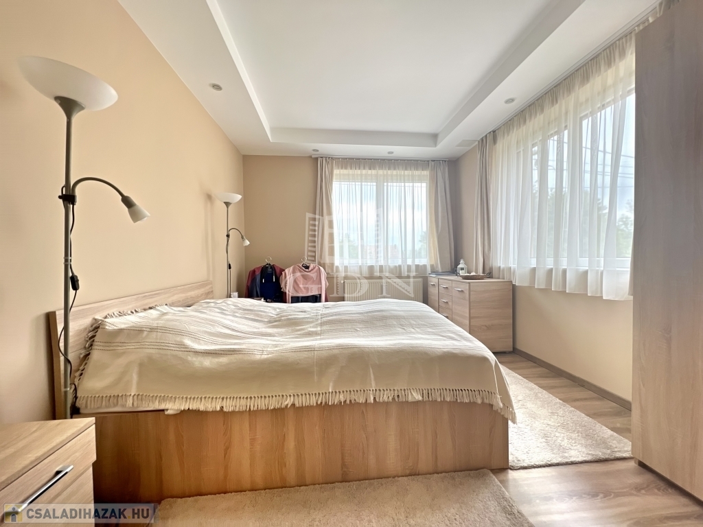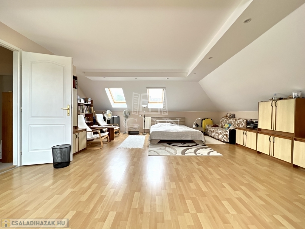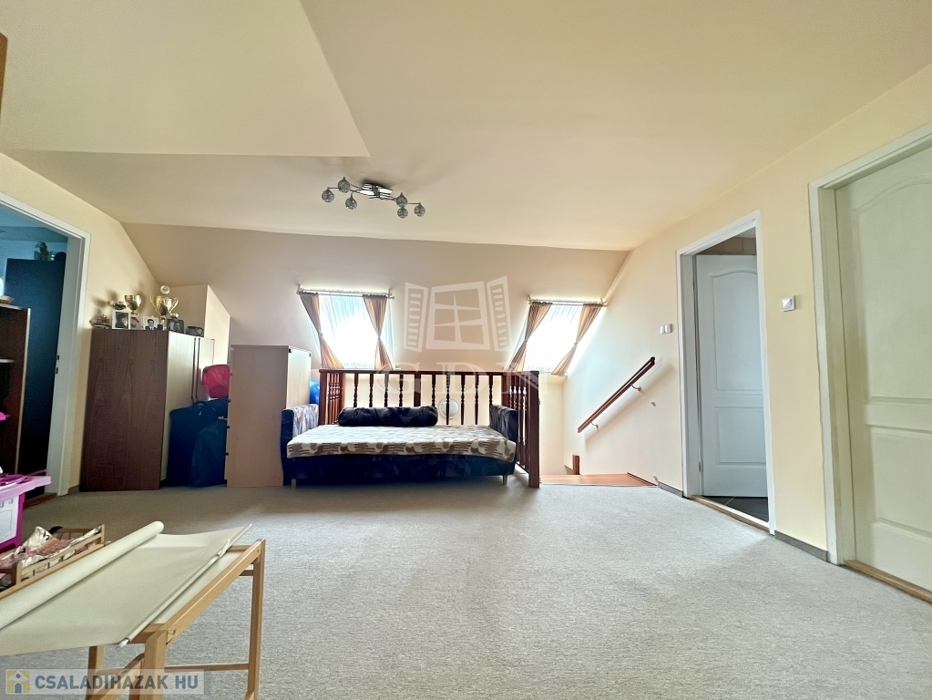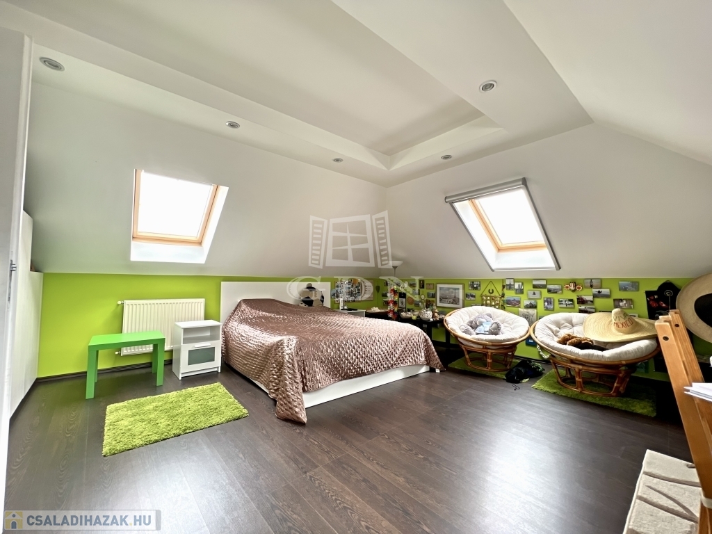 A ház elrendezése kifejezetten jól átgondolt. A földszinten tágas nappali, étkezős konyha, kamra, fürdőszoba és háztartási helyiség kapott helyet, míg az emeleten több hálószoba, külön fürdő és gardrób szolgálja a kényelmes mindennapokat. A belső terek arányosak, világosak, hosszú távon is jól élhetők – akár nagyobb család, akár több generáció számára is.