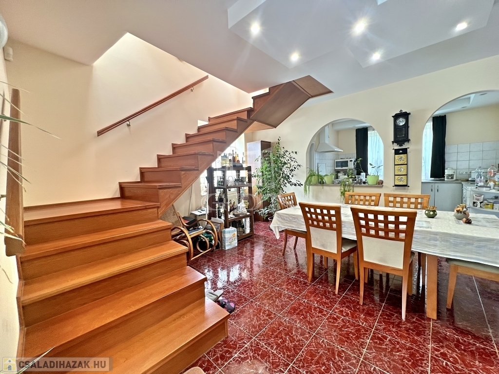A kert rendezett, barátságos hangulatú, fedett kiülővel és kerti sütőhellyel. Ez az a tér, ahol a nyári esték természetesen telnek, különösebb szervezés nélkül. A házhoz terasz, garázs és több autó számára kialakított udvari parkoló is tartozik.