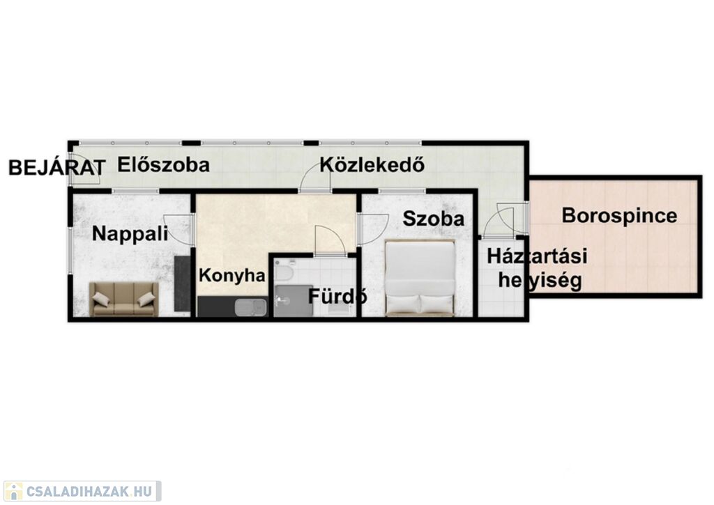 -összesen 85nm-es( konyha, fürdőszoba, 1 nappali, 1 lakószoba, előszoba, közlekedő, háztartási helyiség és egy borospince)