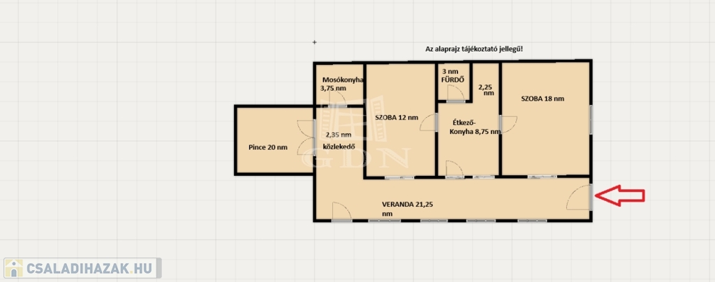A veranda tölti be az előtér szerepét, de akár télikertként is funkcionálhat nagyságából adódóan. A 20 nm-es pince lehet hobbi szoba, de helyet adhat baráti vagy családi összejöveteleknek is.