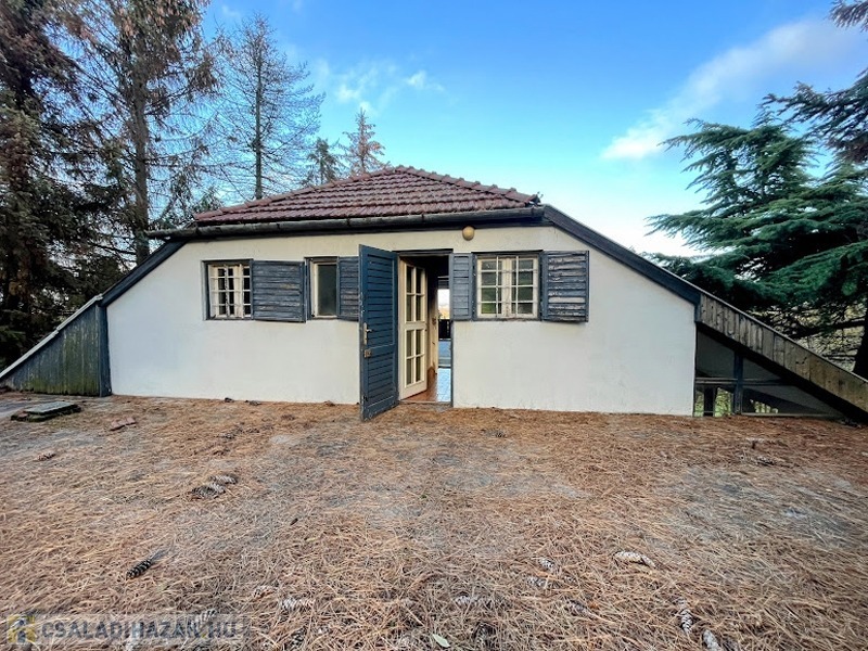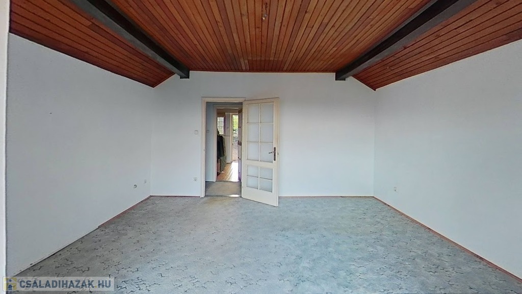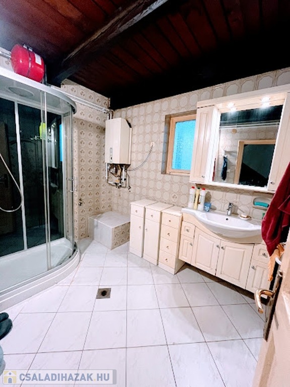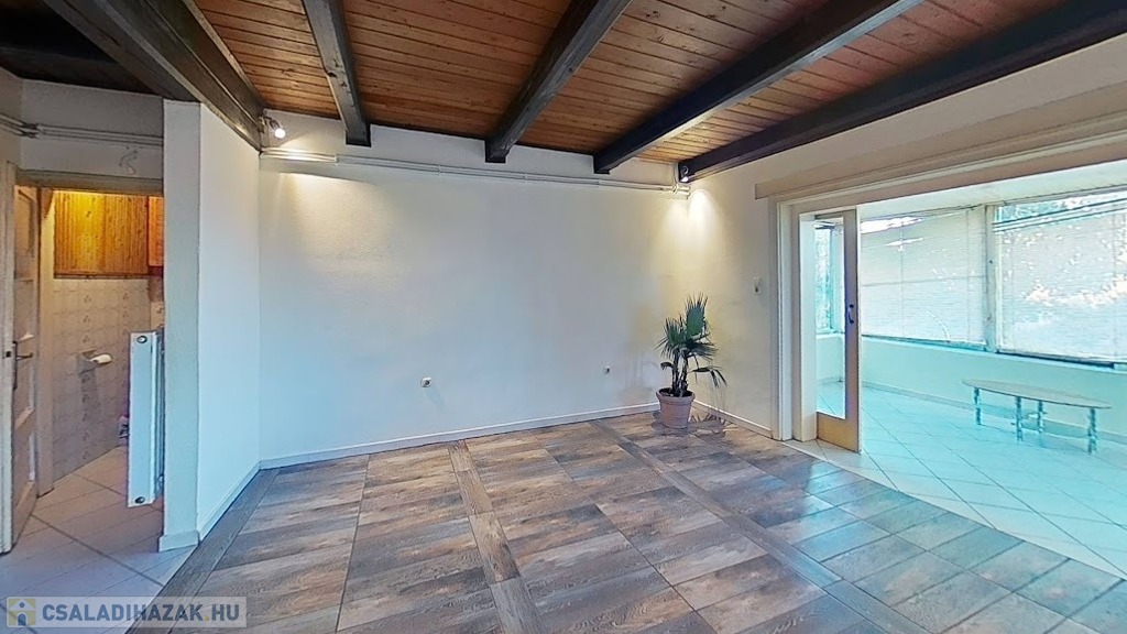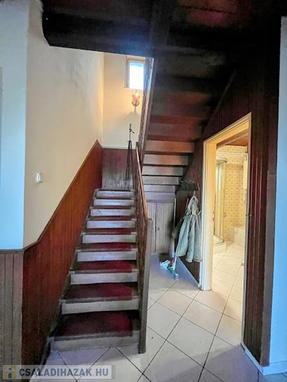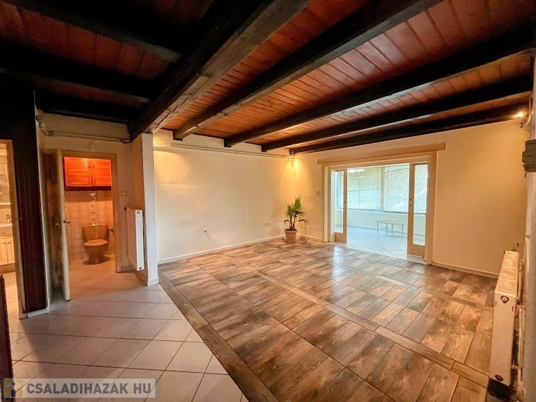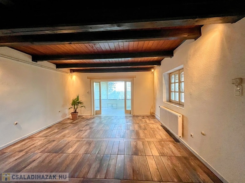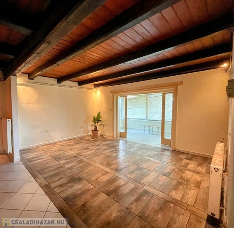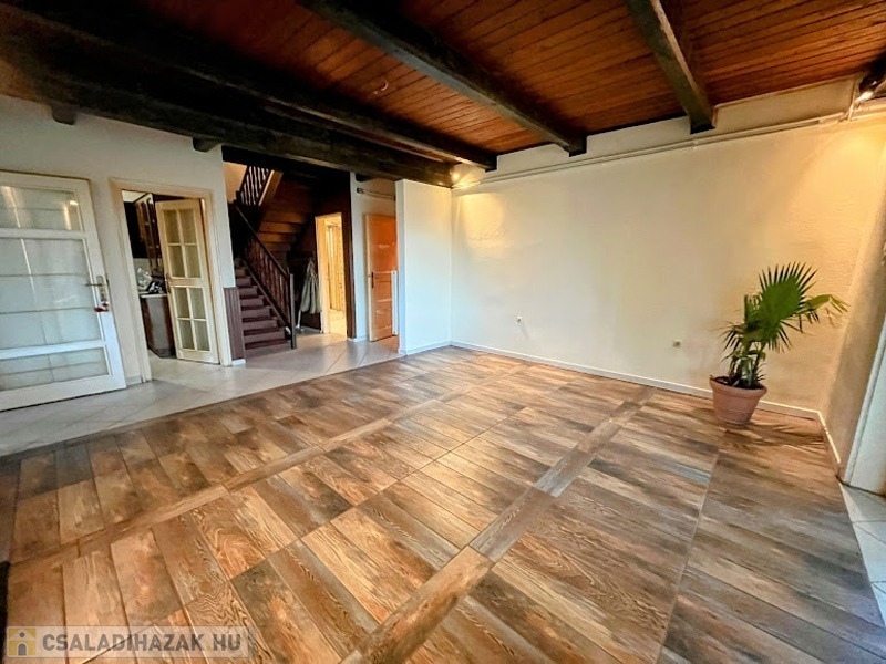 Az alsó szinten, nagy fedett terasz, nappali (vörösfenyő gerendákkal), konyha, külön wc, zuhanyzós fürdőszoba, étkező. (hidegburkolatok)