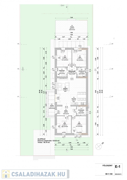 Nettó 126 nm-es lakóterületű, nappali, plusz 4 hálószobás, dupla fürdőszobás, földszintes családi ház 663 nm-es telekkel.