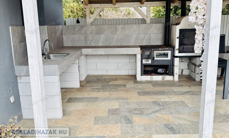 - nagy terasz fedett sütögető résszel és kemencével