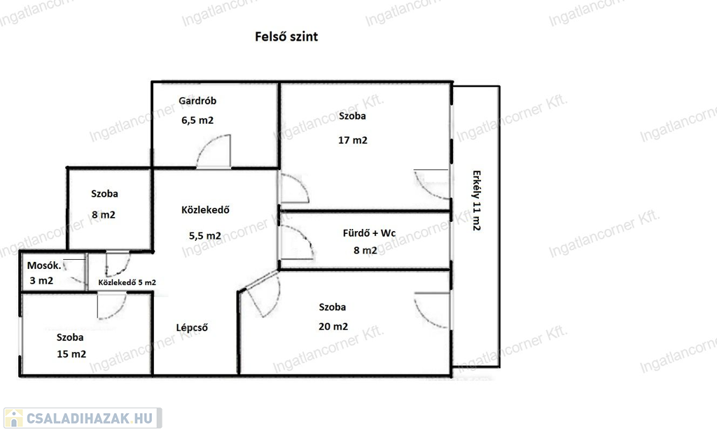 4 hálószoba (20m², 17m², 15m², 8m²),