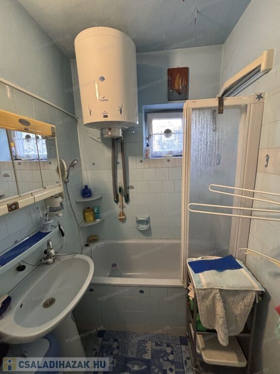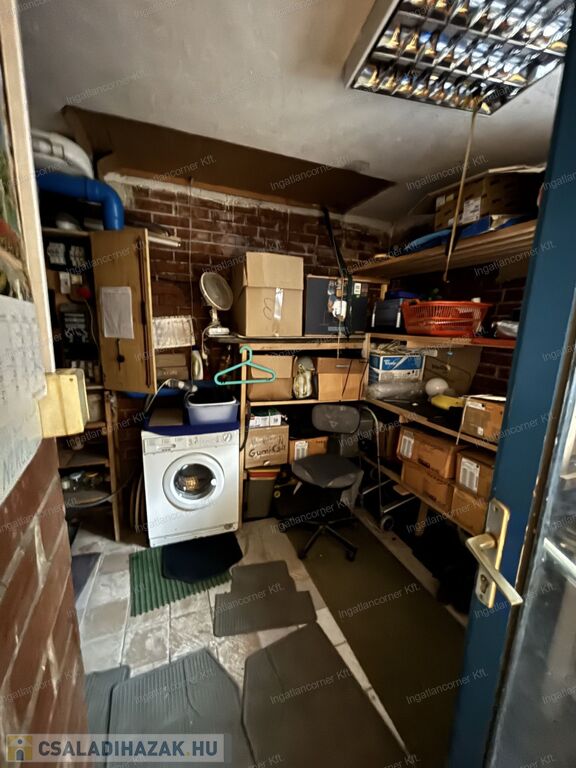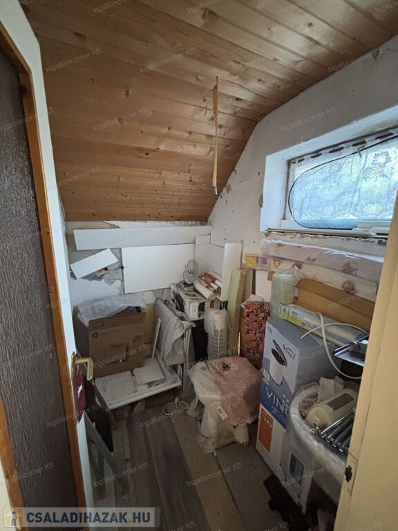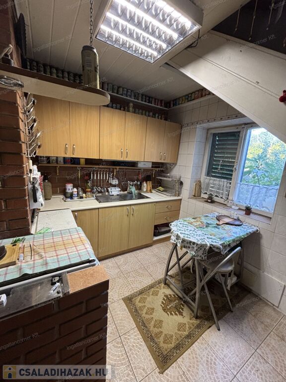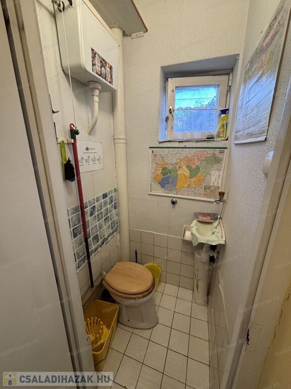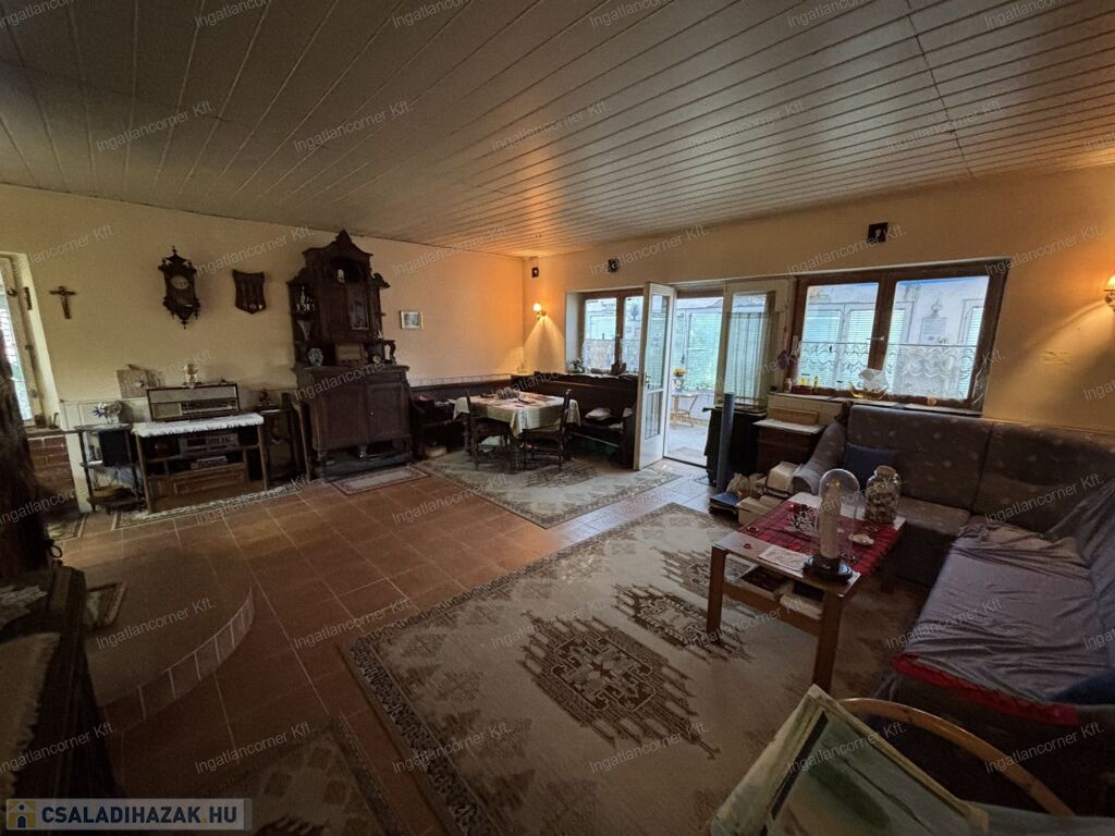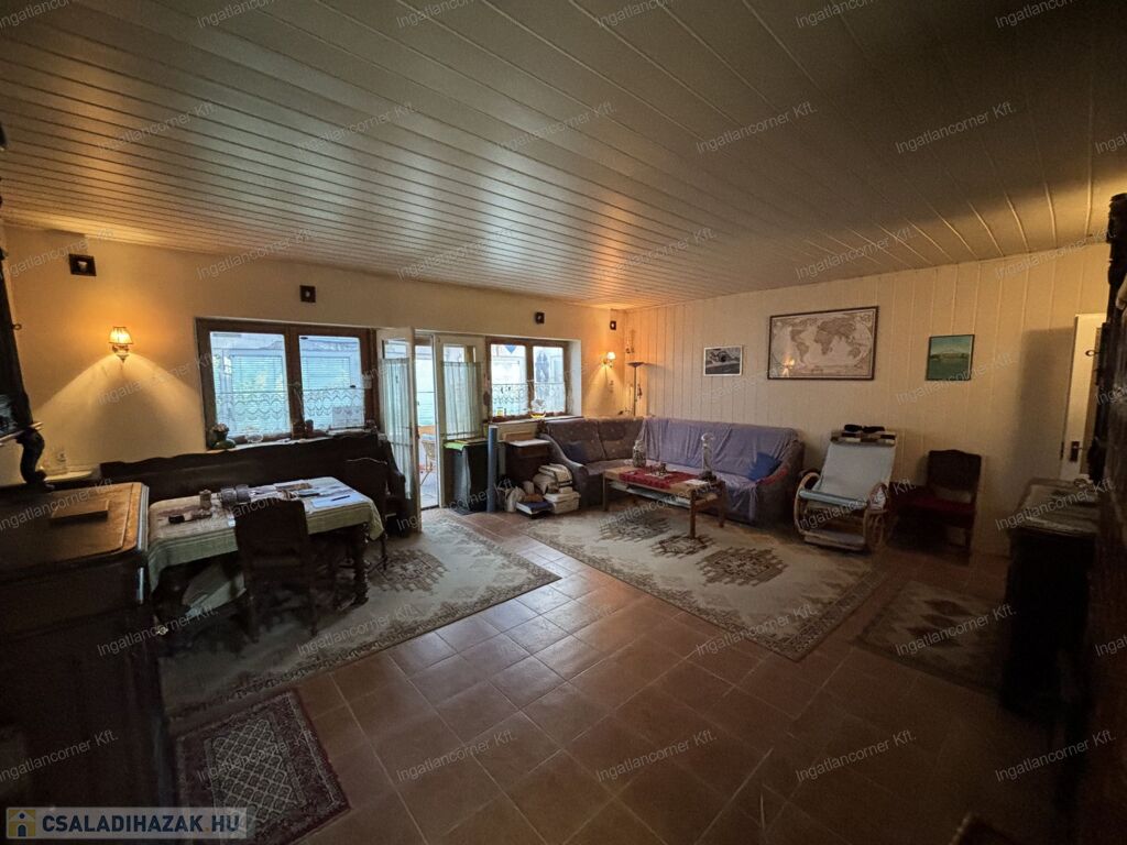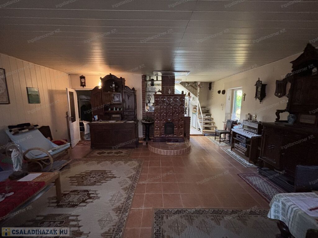 Az ingatlan földszinti részén találjuk a rendkívül tágas nappalit, az étkezőrésszel kialakított konyhát, a fürdőszobát és WC-t. A nappaliban egy jó állapotú cserépkályha is helyet kapott.
