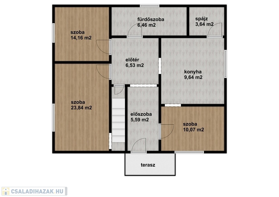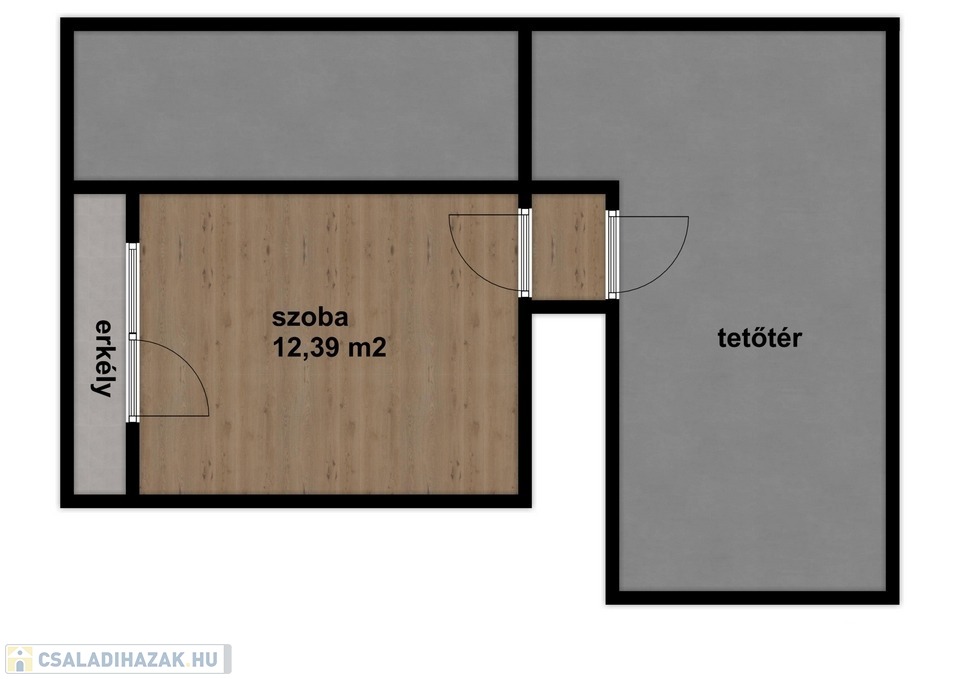 A nappaliból, egy lépcsőn megyünk fel a tetőtérbe, ahol a harmadik szoba található erkéllyel. Itt igény esetén, két szoba kialakítható.