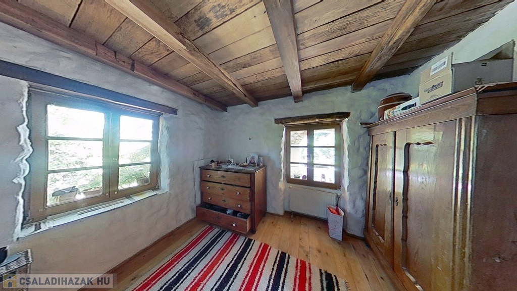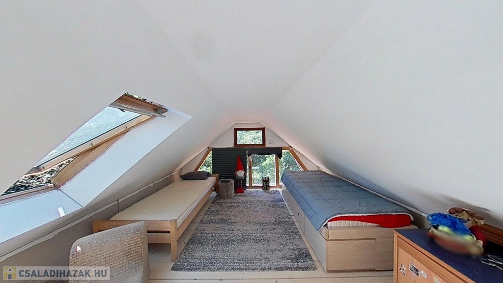A tetőtér további egy 32,5 m2-es hálószobát foglal magába, mely egy légtér jelenleg, de igény szerint ketté osztható. A szinteket egyedi kézműves rönkfa lépcső köti össze.