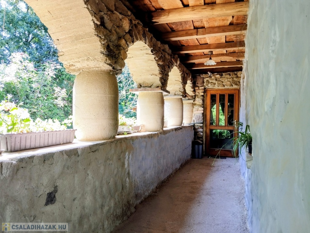 Alapozása betonalap, falai 55 cm-es kőfalak, dupla hőszigetelt fa nyílászárókkal, természetre tekintő nagy üvegfelületekkel a földszinten, ahol egy tágas, amerikai konyhás nappali-étkező, fürdőszoba és hálószoba került kialakításra. Két bejárata van a háznak, az utca felől egy 12,5 m2-es tornácos, fedett terasz, a patak felől egy félig fedett 30 m2-es hátsó terasz került kialakításra.