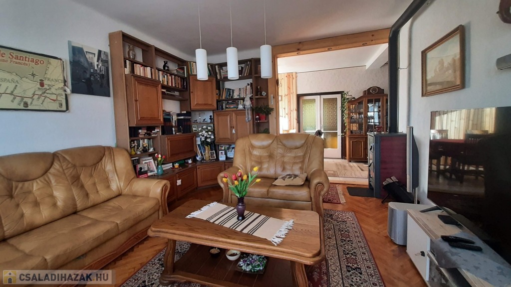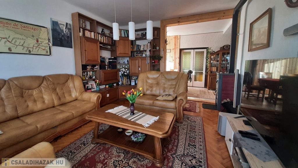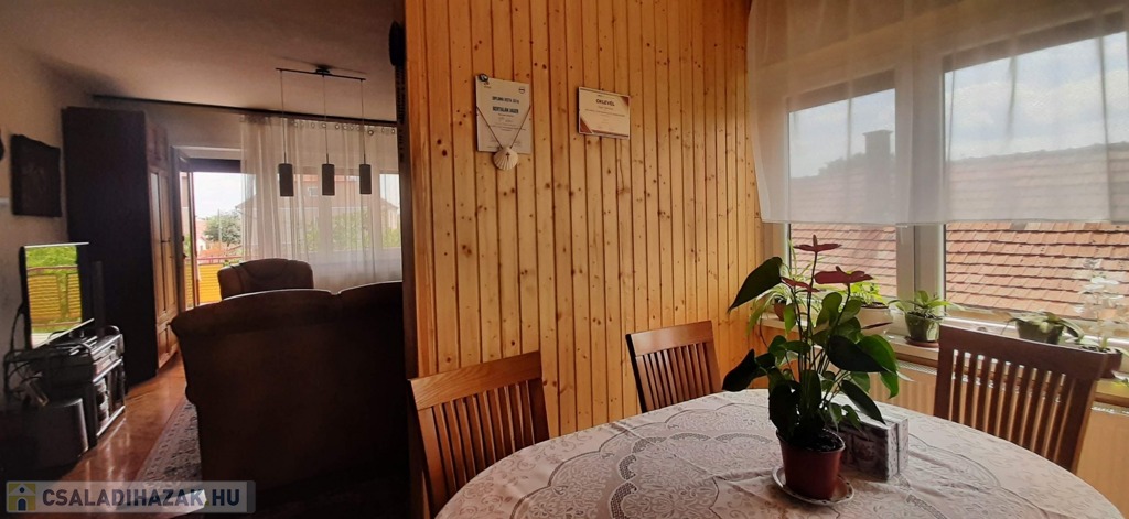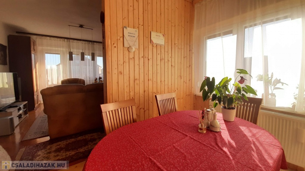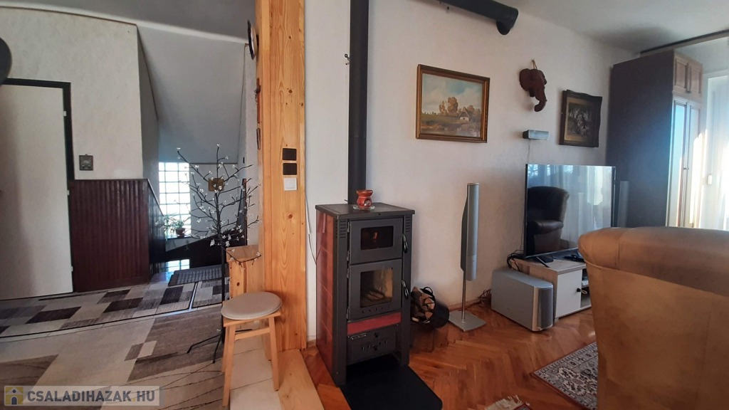 A felső szinten található egy étkezős nappali, mely meglehetősen tágas és világos, itt egy részen már felhelyezésre került az új lambéria. Egy kis pluszt jelent a vadonatúj kandalló, mely nagyon hangulatos a hideg téli estéken.