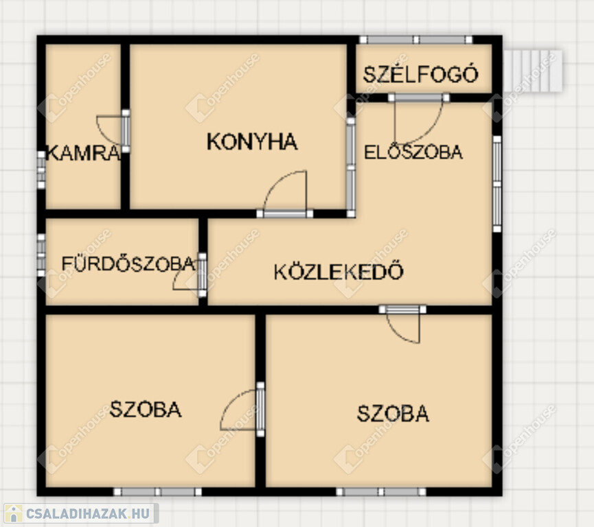 Elosztás: két szoba, konyha, kamra, közlekedő, előszoba, fürdőszoba