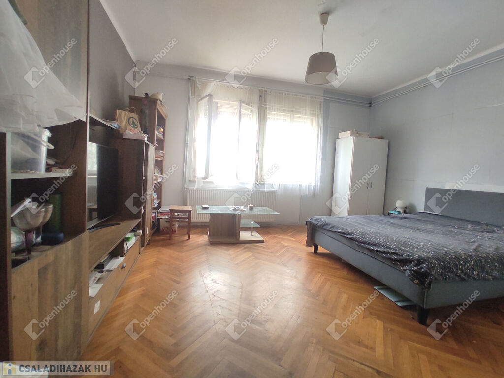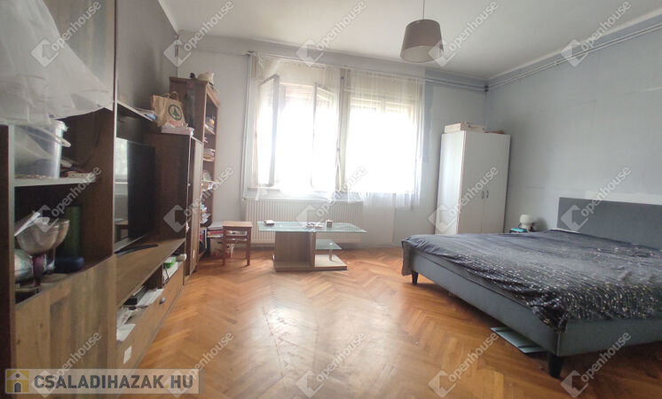 Belső elrendezése jelen kialakításában: előszoba-közlekedő, étkező, nappali, konyha, fürdőszoba, három külön nyíló kényelmes méretű szoba.