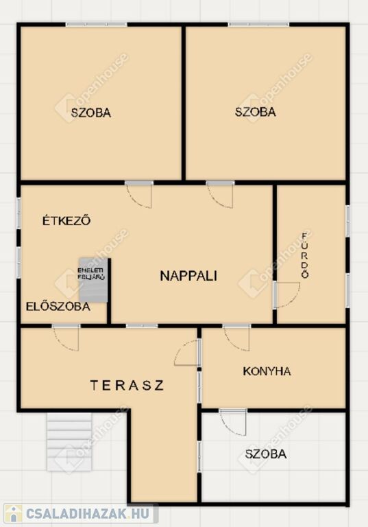 Bejárata előterében kényelmes kialakítású terasz, mely két bejárást biztosít az ingatlanba.