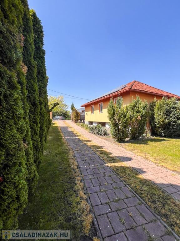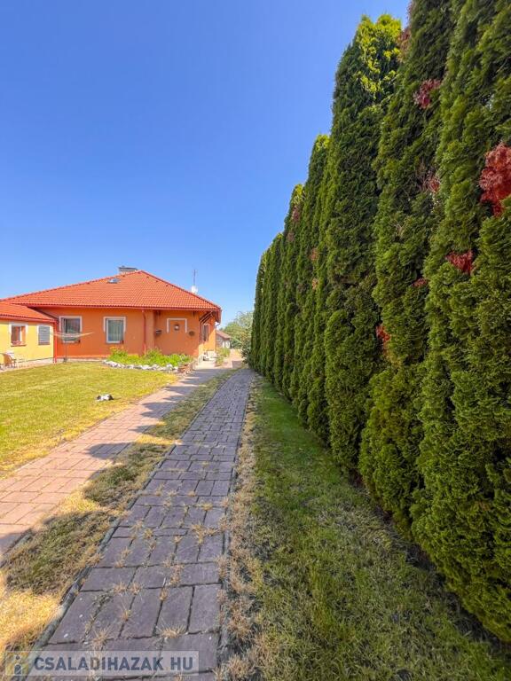 Az ingatlanhoz tartozó 1171 négyzetméteres belső udvar egyedülálló környezetet biztosít, ahol a természet és a kényelem harmonikusan egyesül. A tervezés és kialakítás minden részletére odafigyeltek, hogy kellemes és élvezetes helyszínt nyújtson a lakók és látogatók számára. Az udvart magas tuják és elegáns tégla kerítés veszi körül, amelyek intimebb és meghittebb légkört teremtenek, miközben védett érzetet biztosítanak. A gondosan parkosított területek és a megválasztott növényzet hozzájárulnak az udvar szépségéhez és ápoltságához, míg a térkövezett részek egyszerű karbantarthatóságot biztosítanak, így az udvar mindig rendezett és vonzó marad. Az öntözést fúrt kútról biztosítják, ami hatékony és fenntartható megoldást jelent a növények frissességének megőrzésére, csökkentve ezzel a vízfelhasználást és a költségeket.