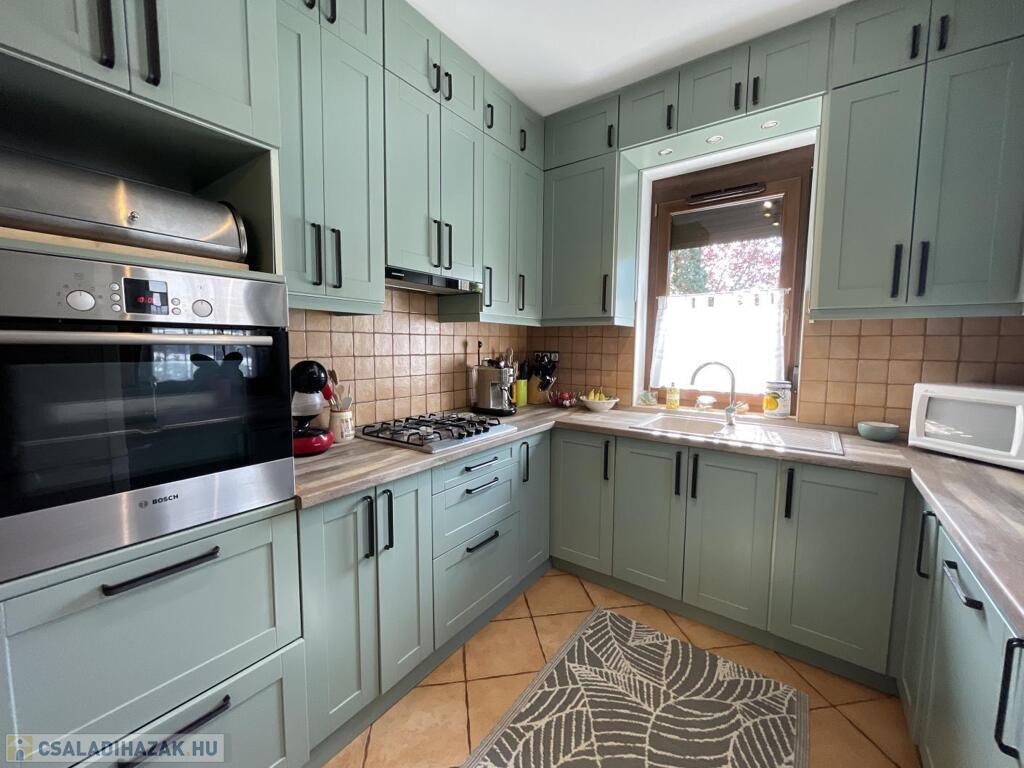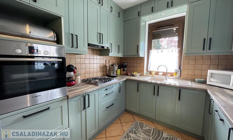 A belépőt tágas, nappali fogadja, amely harmonikusan kapcsolódik az étkezőhöz és a stílusos, modern konyhához. Az egyedi, halványzöld konyhabútor prémium beépített gépekkel (Bosch sütő, főzőlap stb.) felszerelt. A földszinten továbbá helyet kapott egy külön WC és egy praktikus kamra is. A tér elrendezése kifejezetten élhető, a helyiségek természetes módon kapcsolódnak egymáshoz.