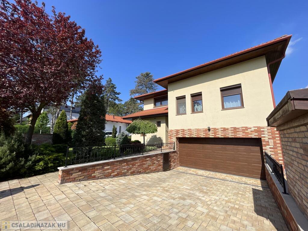 A telket elegáns kovácsoltvas kapu és térkövezett bejáró határolja. A biztonságról és praktikusságról Hörmann dupla garázskapu, fúrt kút, valamint modern öntözőrendszer gondoskodik.