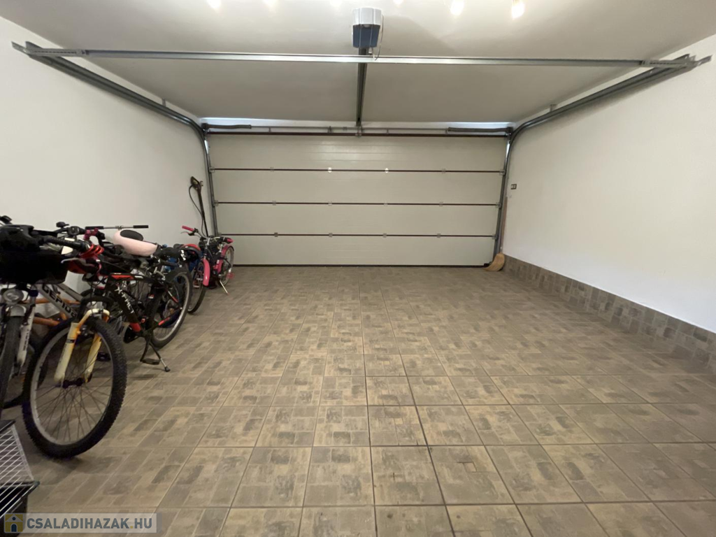 A telket elegáns kovácsoltvas kapu és térkövezett bejáró határolja. A biztonságról és praktikusságról Hörmann dupla garázskapu, fúrt kút, valamint modern öntözőrendszer gondoskodik.