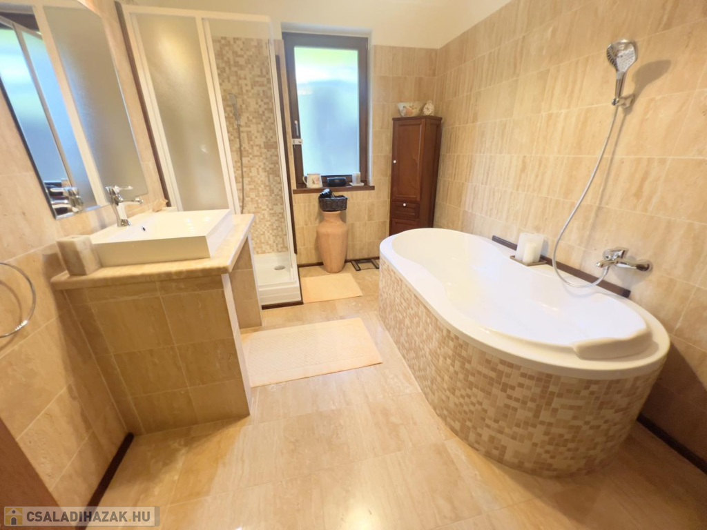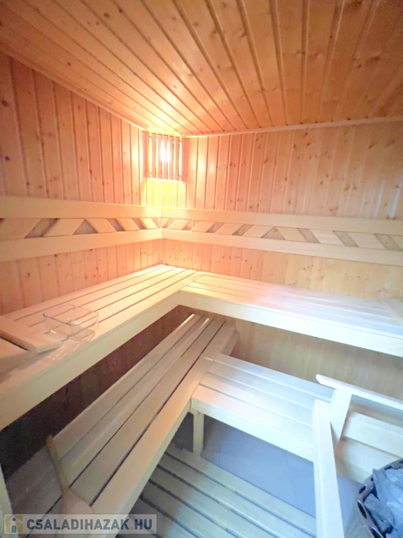 A szuterén külön kis birodalom: itt kapott helyet egy vendégszoba, egy vadonatúj fürdőszoba, egy kényelmes szauna, valamint a gépészet.