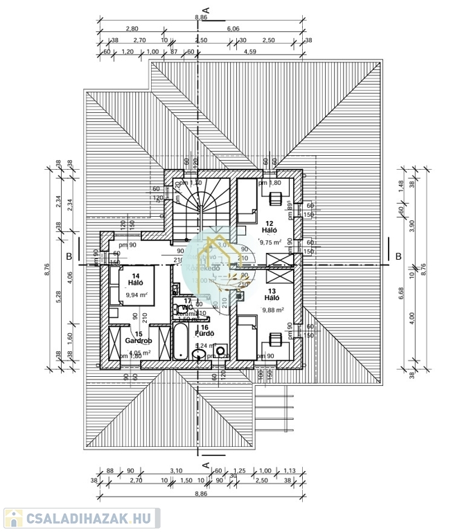 A ház 38-as Porotherm téglából épült, 12 cm-es szigeteléssel, a tetőn terrakotta cserépfedés.