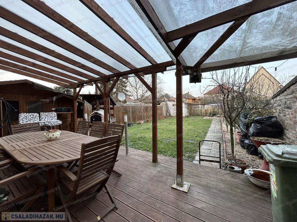 A házhoz kapcsolódik egy 40 m2-es, fedett terasz is, amely megnöveli az életteret. A házban található egyedi bútorok (gardrób, beépített szekrények, konyhabútor gépek nélkül) a vételár részét képezik.