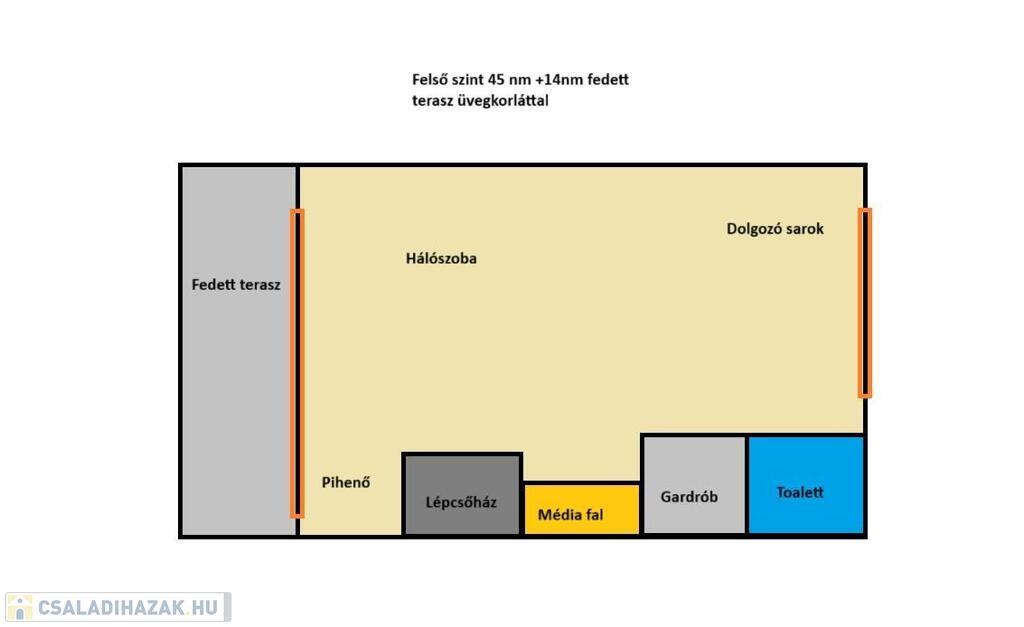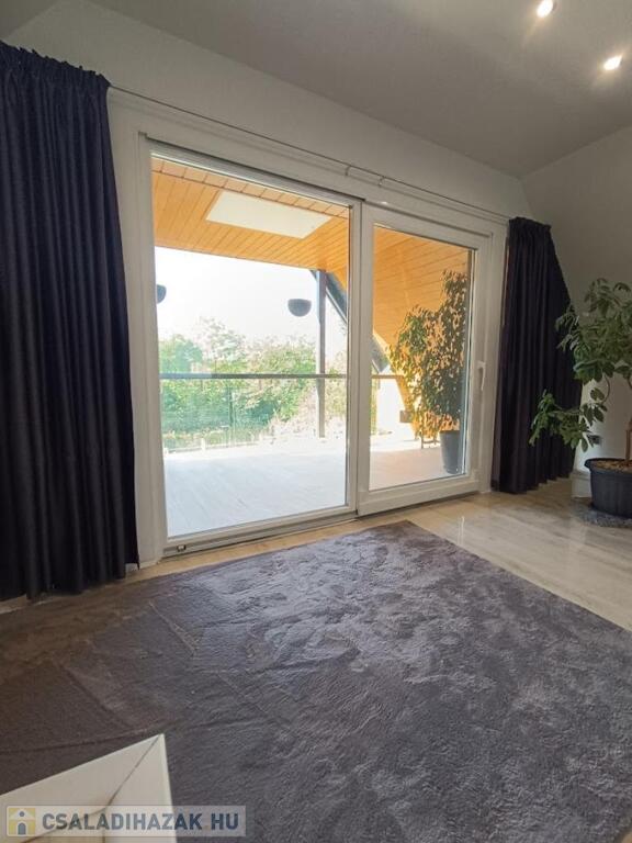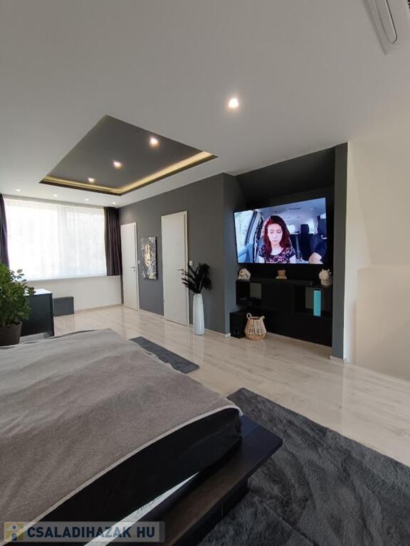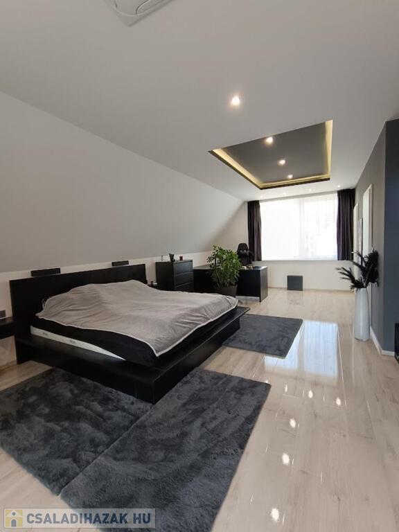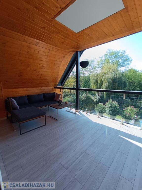 Az emeletre vezető lépcső után egy világos, tágas hálótér fogad, hatalmas franciaággyal, dolgozósarokkal, LG TV-vel, házimozival és tetőklímával. Innen nyílik a hangulatos, fedett terasz, ahol jólesik reggel kávézni, miközben hallgatod az erdő madarait. A felső szint nagy szobája könnyen egy gipszkarton fallal leválasztható így alakítható ki a 3 szoba.