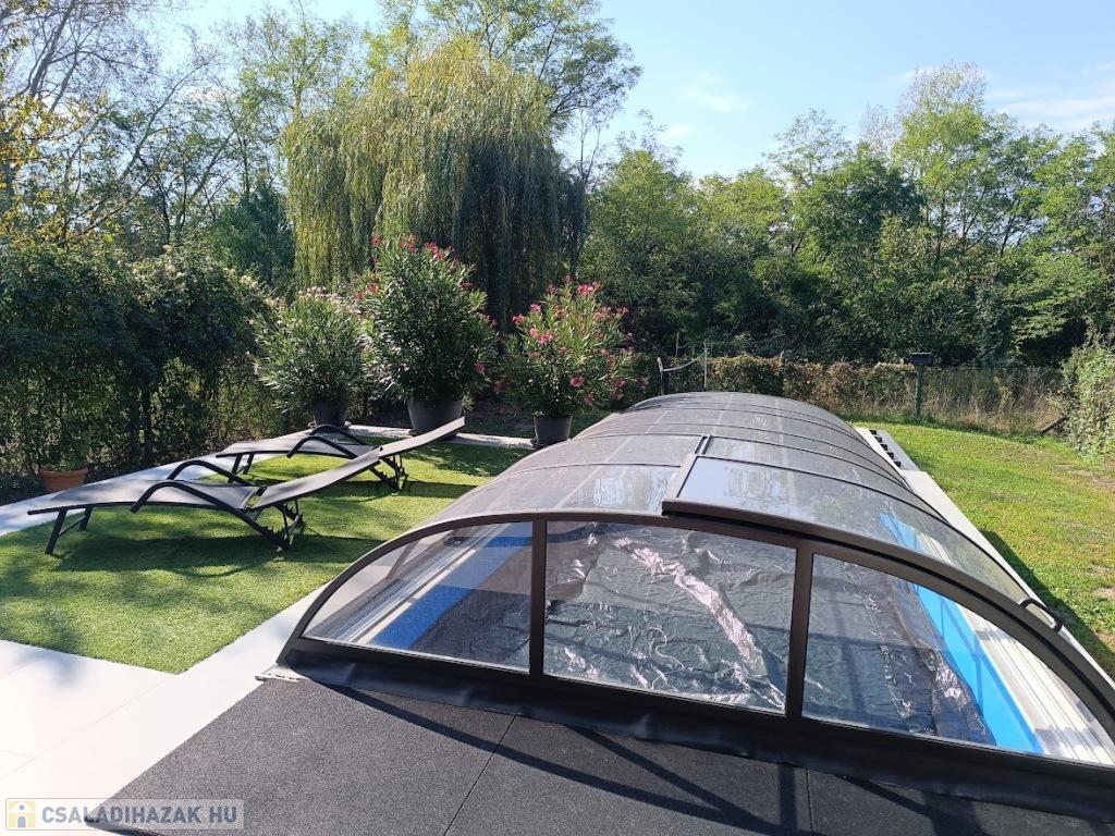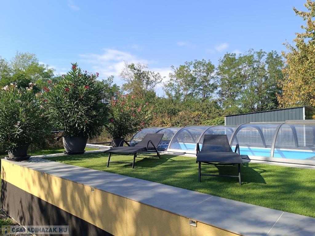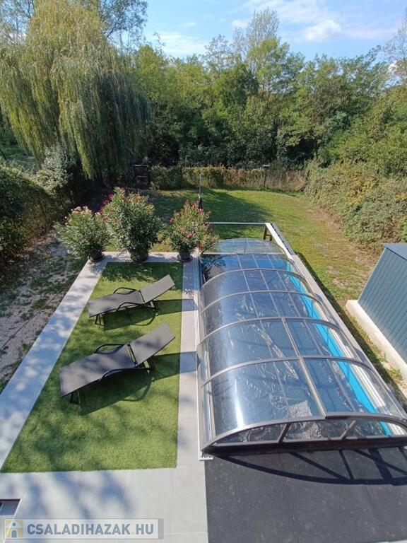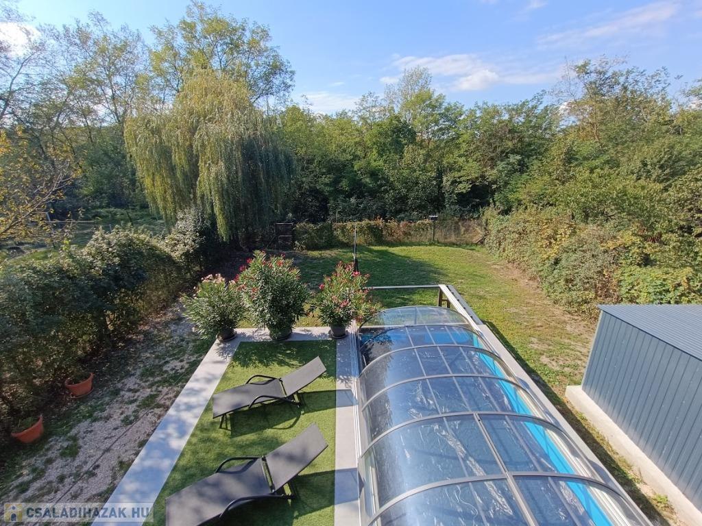 Már az udvaron megérzed a harmóniát: a 5×3 méteres, fedett medence, a műfüves napozórész és a tágas, fedett terasz gázos grillel hívogat, hogy eltölts egy nyugodt délutánt a családdal vagy barátokkal. A hátsó kertből az erdő látványa köszönt vissza – igazi feltöltődés minden nap.