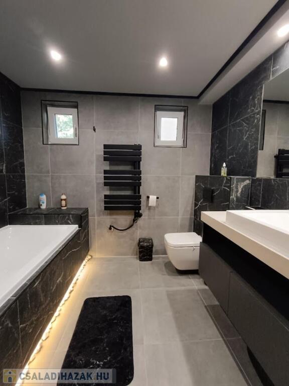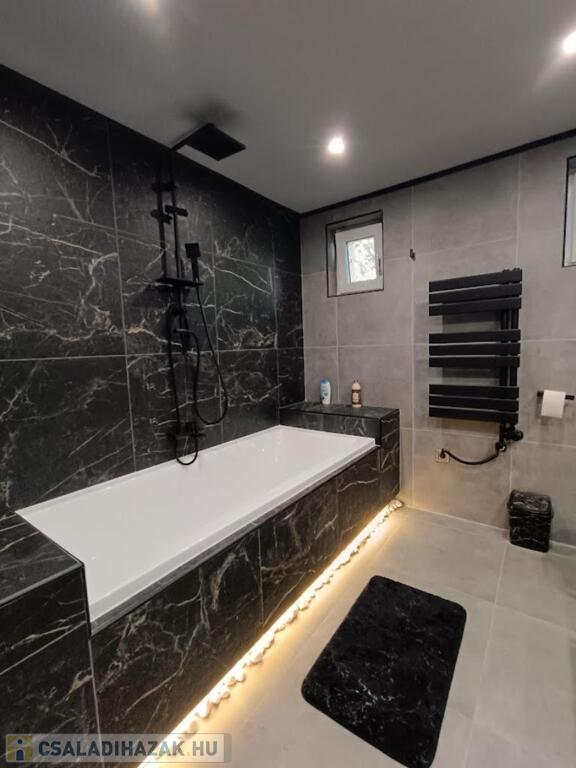 A fürdőszoba fekete csaptelepekkel, káddal modern eleganciát sugároz.