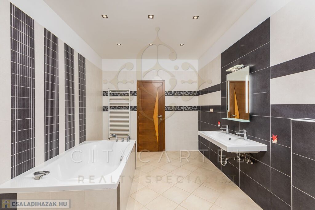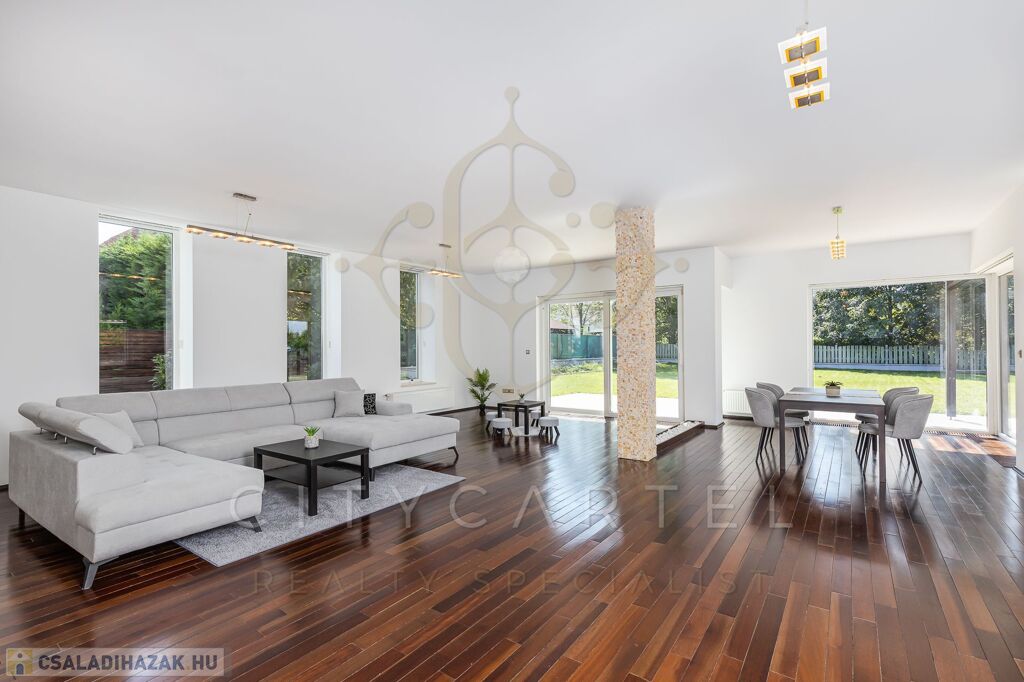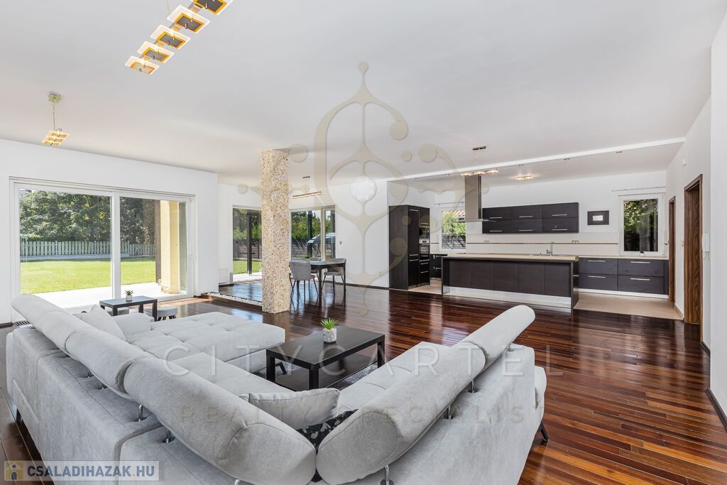Budapest centrumától Ca. 20 km. – re, 20 percre, 950 nm parkosított telken, 2001-2010 között épült, energiatakarékos, gazdaságos fenntartású, nettó: 350 nm, bruttó: 420 nm, kétszintes, 6 szobás, neves építőművész által, racionálisan megtervezett, LUXUS családi ház eladó.