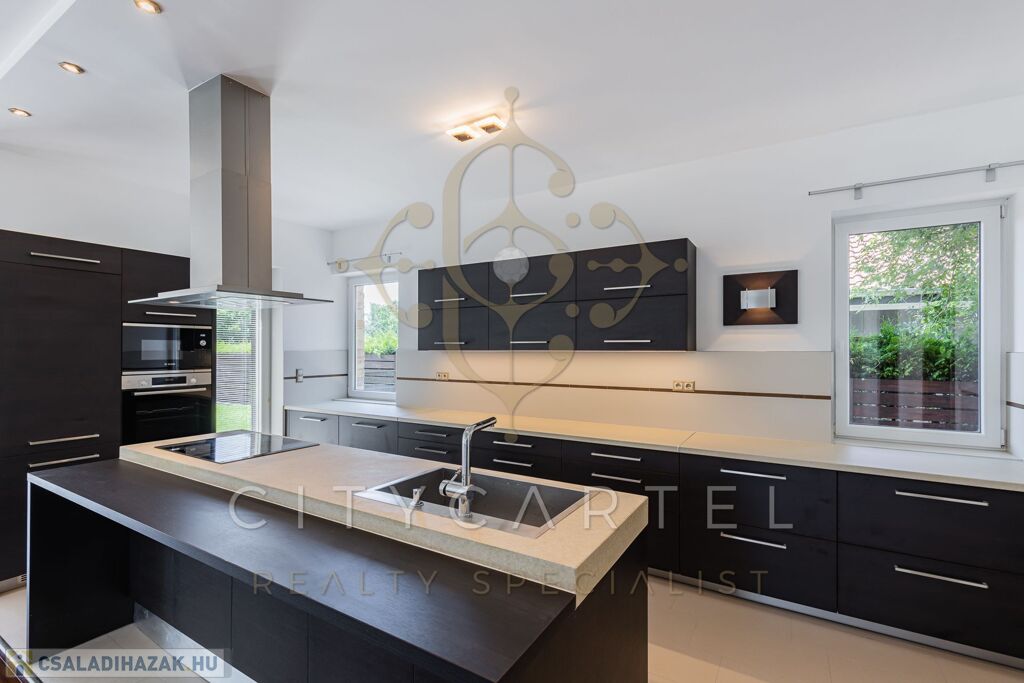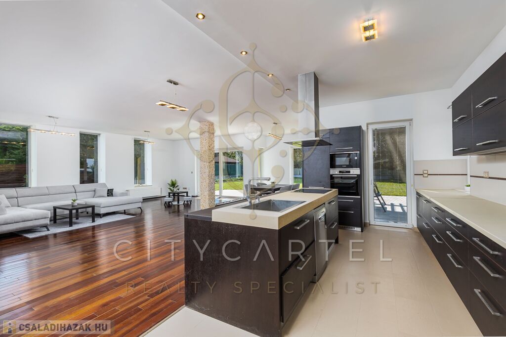 A minimál stílusban, minőségi anyagok felhasználásával, megépített, panorámás házat, beragyogja a fény, amit a gyönyörű nagy nyílászáróknak köszönhet. A ház amerikai konyhás nappalija 95 nm, nyáron a nyitott terasszal + 60 nm-es. Az elegáns konyha, korszerű gépekkel felszerelt.