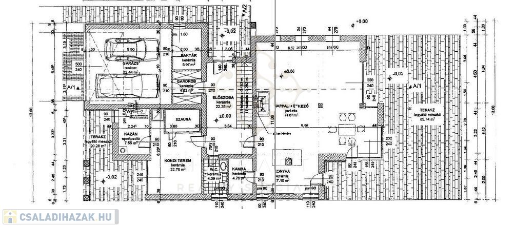 Fsz.: előtér, nappali- étkező, konyha, kamra, szauna, konditerem, gardrób, toalett, dupla garázs, tároló, kazánház, teraszok.