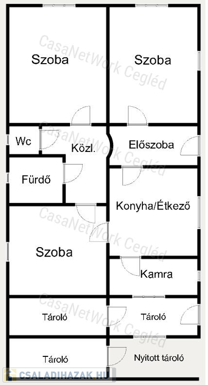 - Helyiségek elosztása: 3 külön nyíló szoba, külön fürdő-wc, konyha, kamra, előszoba, közlekedő