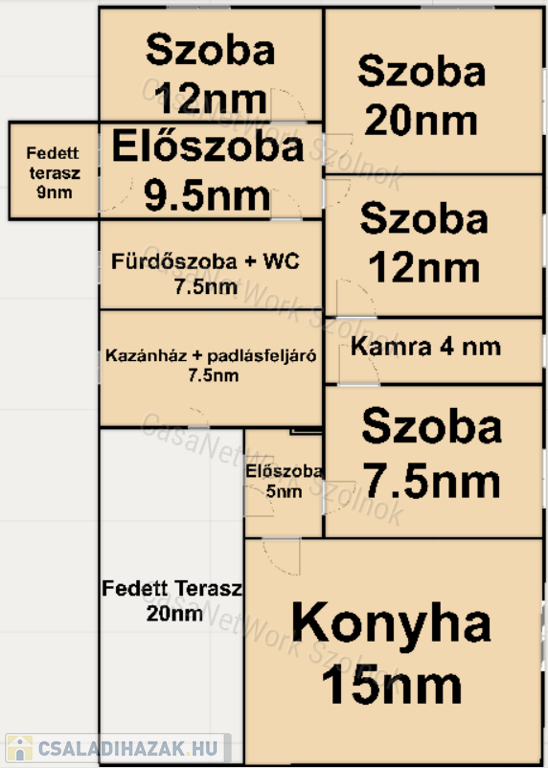 - rendelkezésre álló helyiségek: 4 szoba, 1 félszoba, kamra, konyha, kazánház, fürdőszoba + WC, előszoba