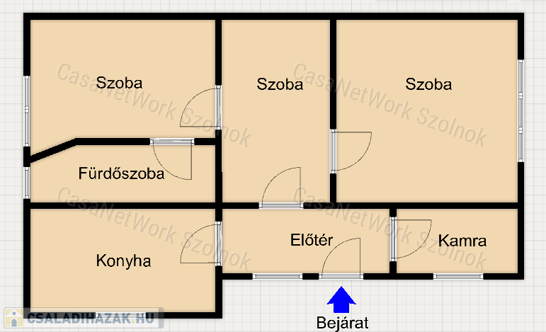 - a nettó lakótér 60 m2, amelyben a következő helyiségek kerültek kialakításra: előtér, konyha, fürdőszoba+illemhely, kamra, és 3 szoba