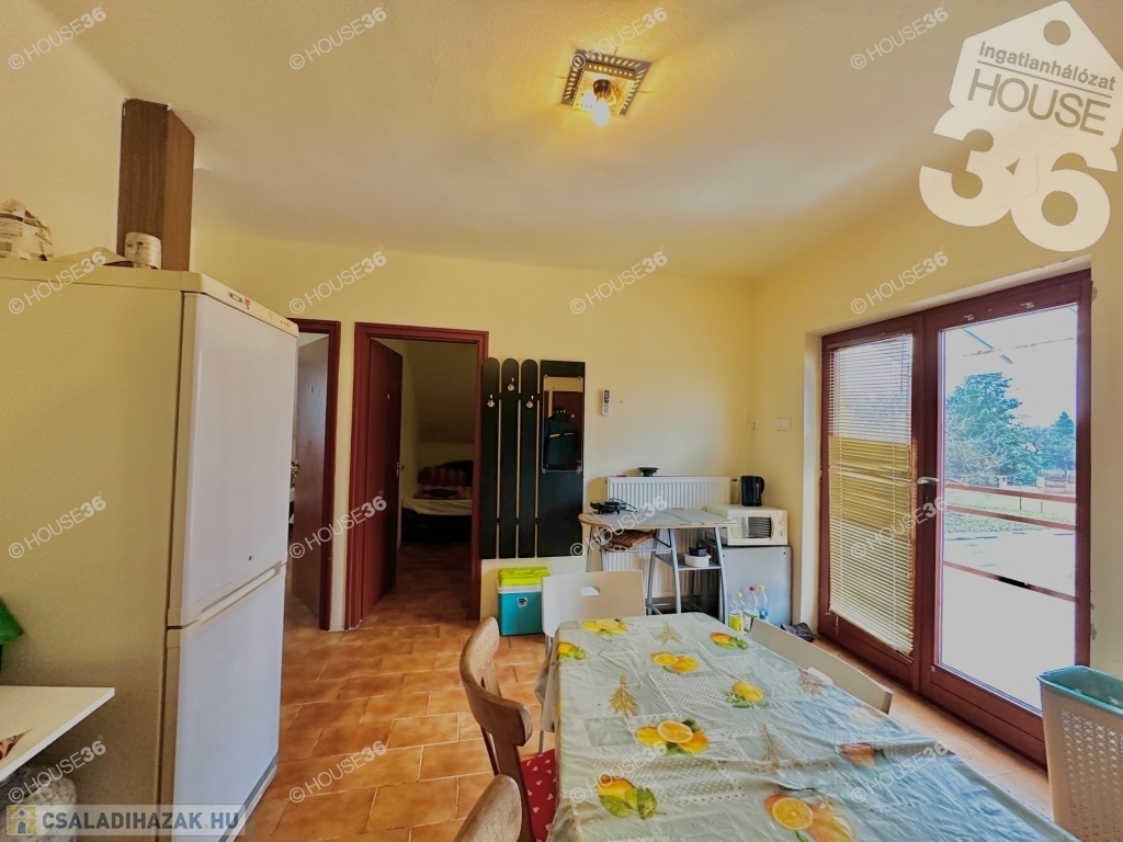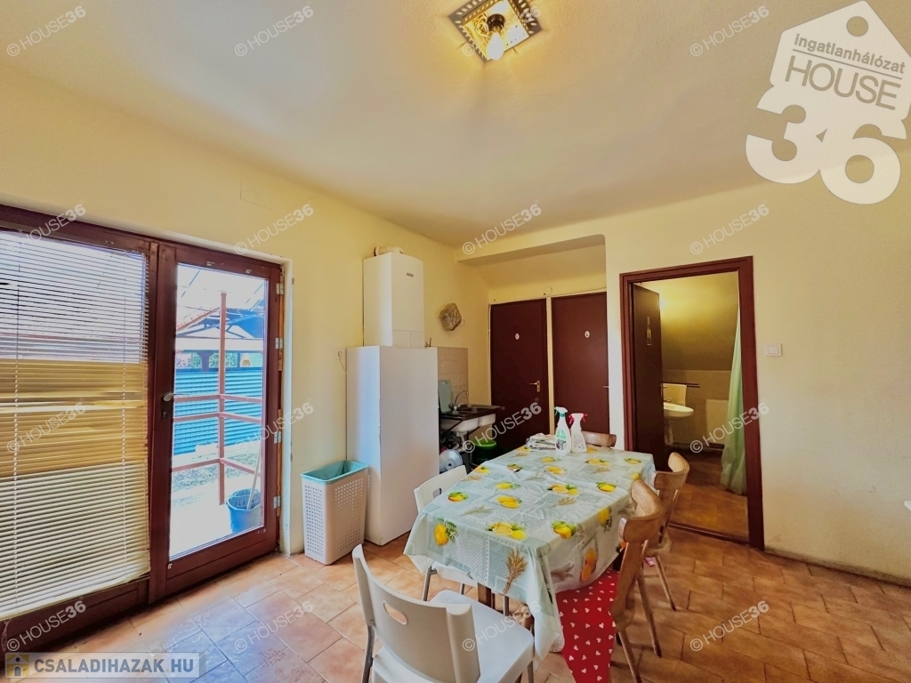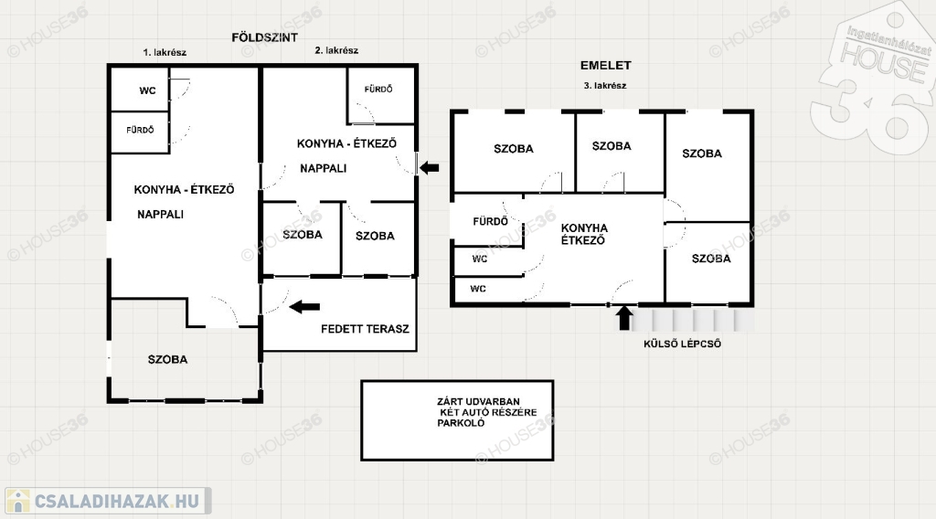 Földszinten fedett terasz és két lakrész, míg az emeleten egy lakórész található. Udvarban 2-3 autó számára parkolási lehetőség.