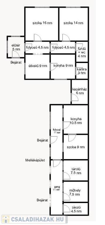 - Az ingatlanban található helyiségek: A szobák 14 m2 és 16 m2 laminált padlós, étkező 9 m2 és a konyha 9 m2 járólap burkolattal. két folyosó egyaránt 4,5 m2 szintén járólap burkolattal, fürőszoba + wc 4 m2 járólap burkolattalkamra egyben kamra és padlásfeljáró 3 m2 járólap burkolattal, előtér 5 m2 PVC padlóburkolattal.