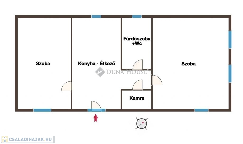Az ingatlanban egy étkezős konyha, két különbejáratú szoba, egy fürdőszoba+wc, és egy közlekedő helyiségek kaptak helyet. Tárolás céljára egy kamra is rendelkezésre áll. Praktikus elrendezése okán optimális fiatalok, összeköltözők, idősek, kisebb családok számára is.