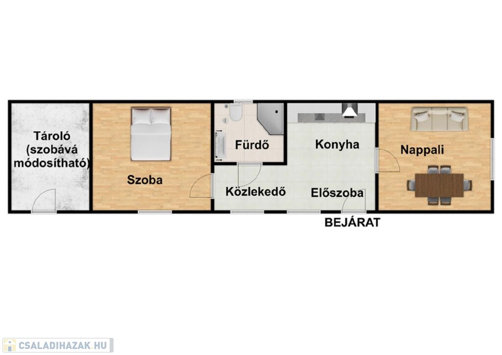 A tágas nappali az ingatlan egyik, konyha, fürdőszoba középen, míg a lakószobák a másik oldalon helyezkednek el lehetőséget kínálva a társasági élet számára.