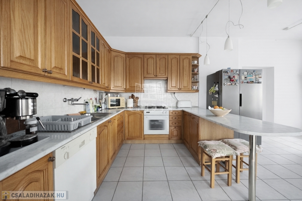 Az étkezős konyha beépített tölgy konyhabútorral, gépesítve az ár részét képezi.