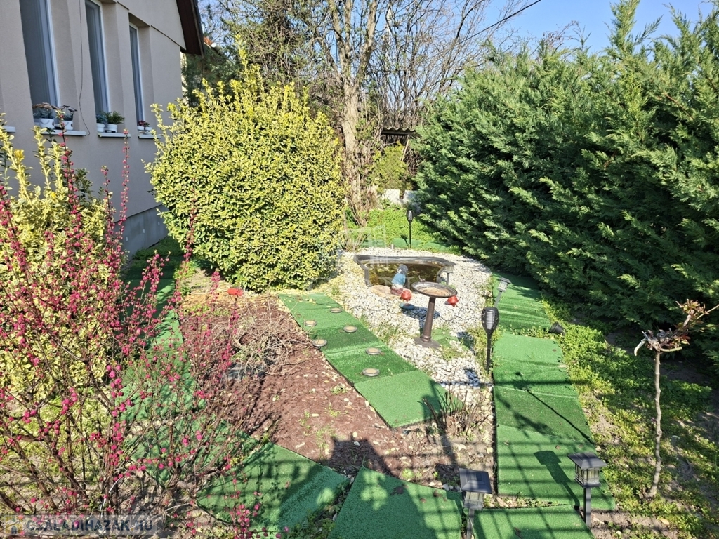 3 garázs, kb 75 nm, kerti tó, viacolorozott kert vezet a garázshoz.